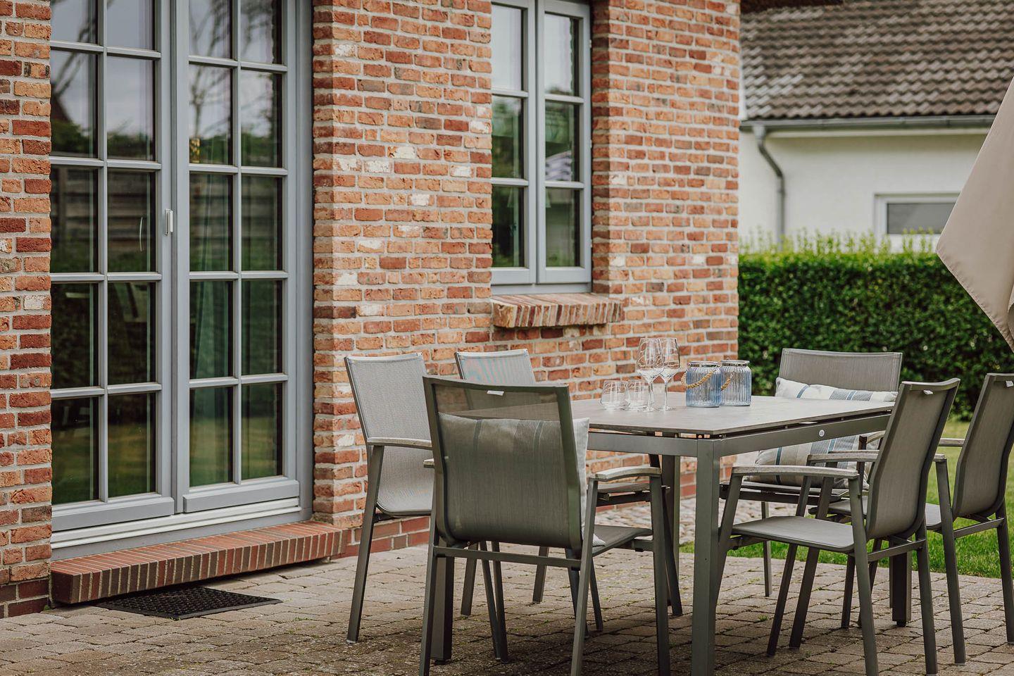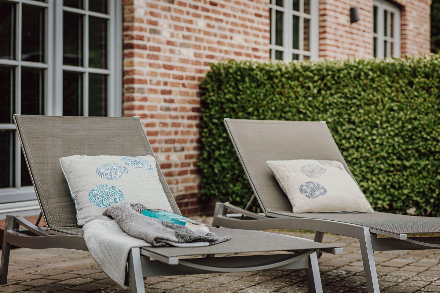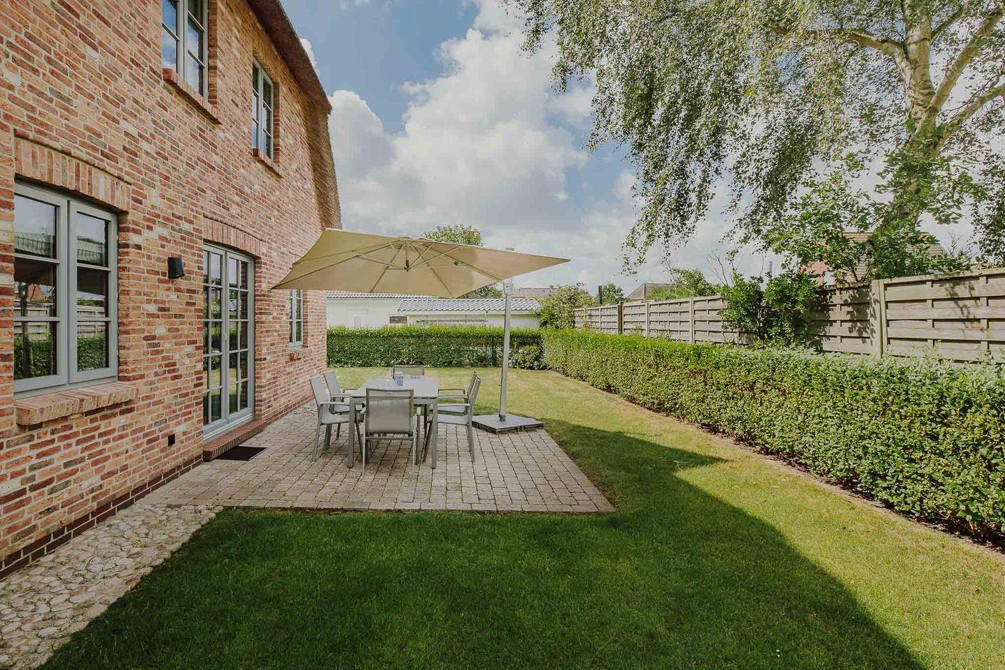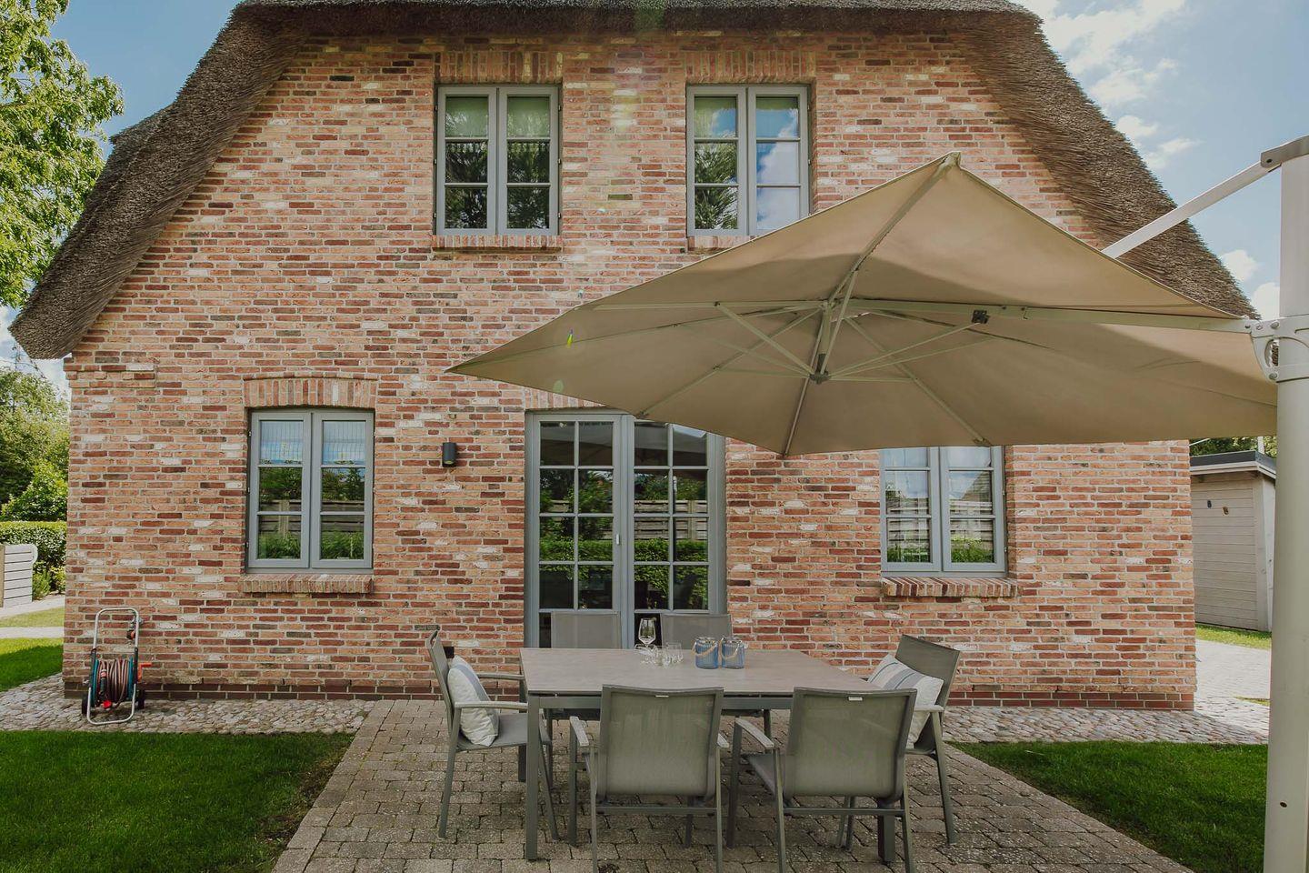 Reetgedeckte Doppelhaushälfte in "friesisch-modernem" Stil mit Original Mylin-Kachelofen, hauseigener Sauna und zwei Terrassen im Garten.