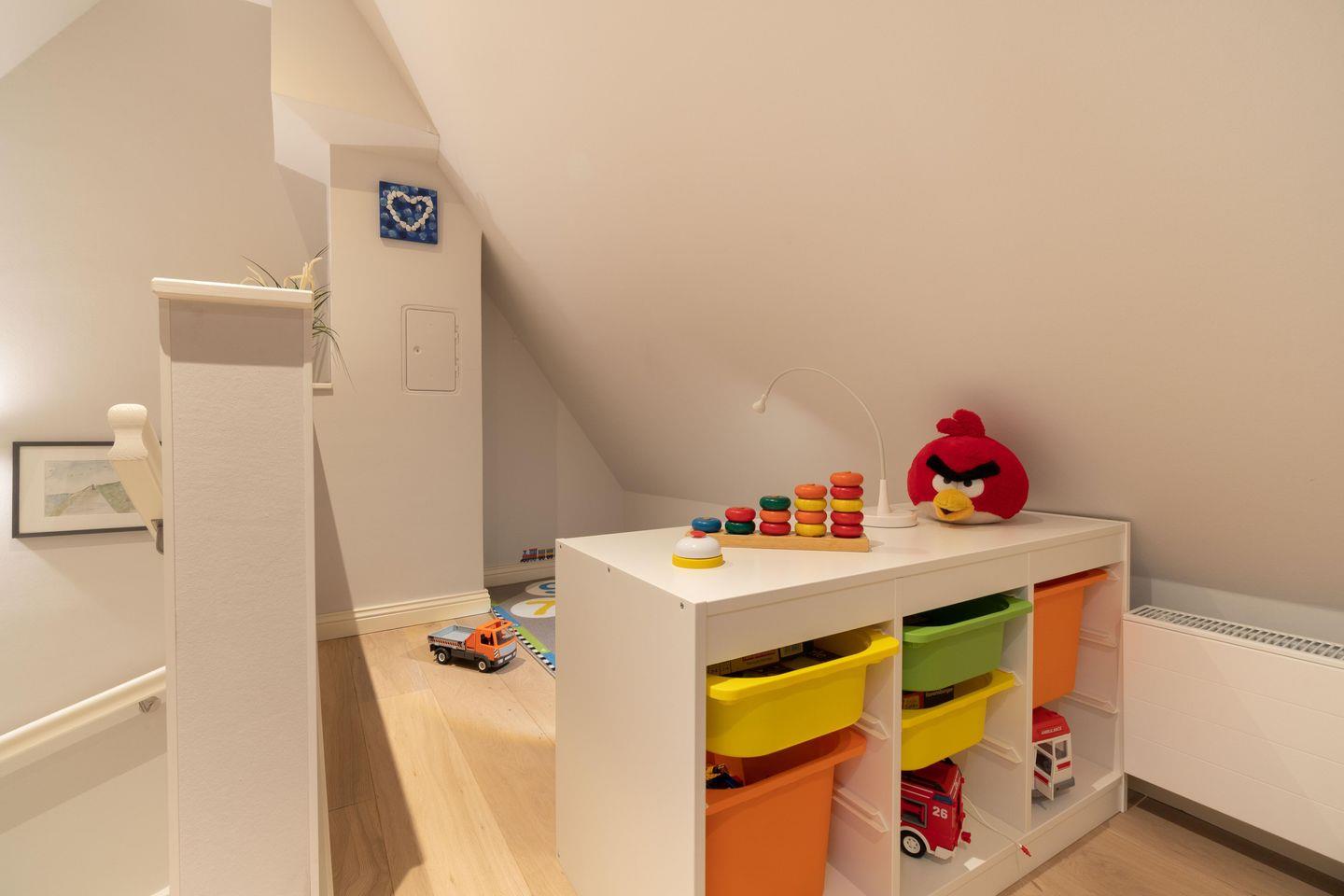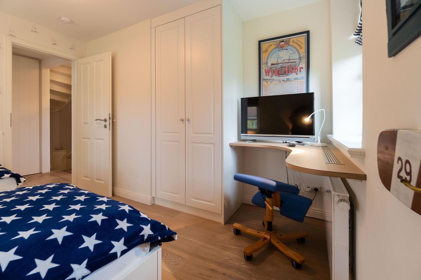 Im Obergeschoss sind die drei Schlafzimmer - zwei mit je einem Doppelbett und eines mit zwei Einzelbetten - sowie das zweite Duschbad gelegen. Zwei Schlafzimmer verfügen jeweils über einen Fernseher und einen Einbauschrank. Die hauseigene Sauna samt Ruhebereich und eine kleine Spielecke befinden sich im Dachgeschoss der Unterkunft.