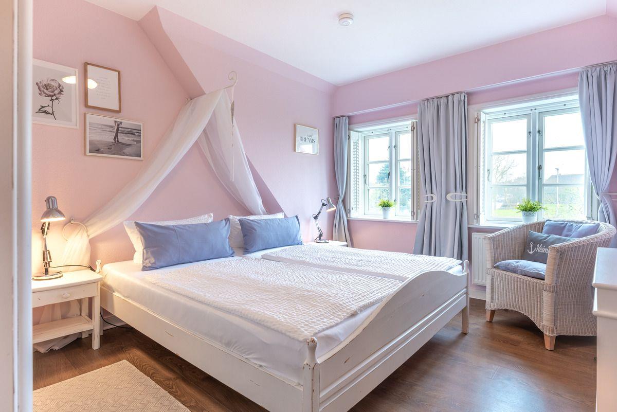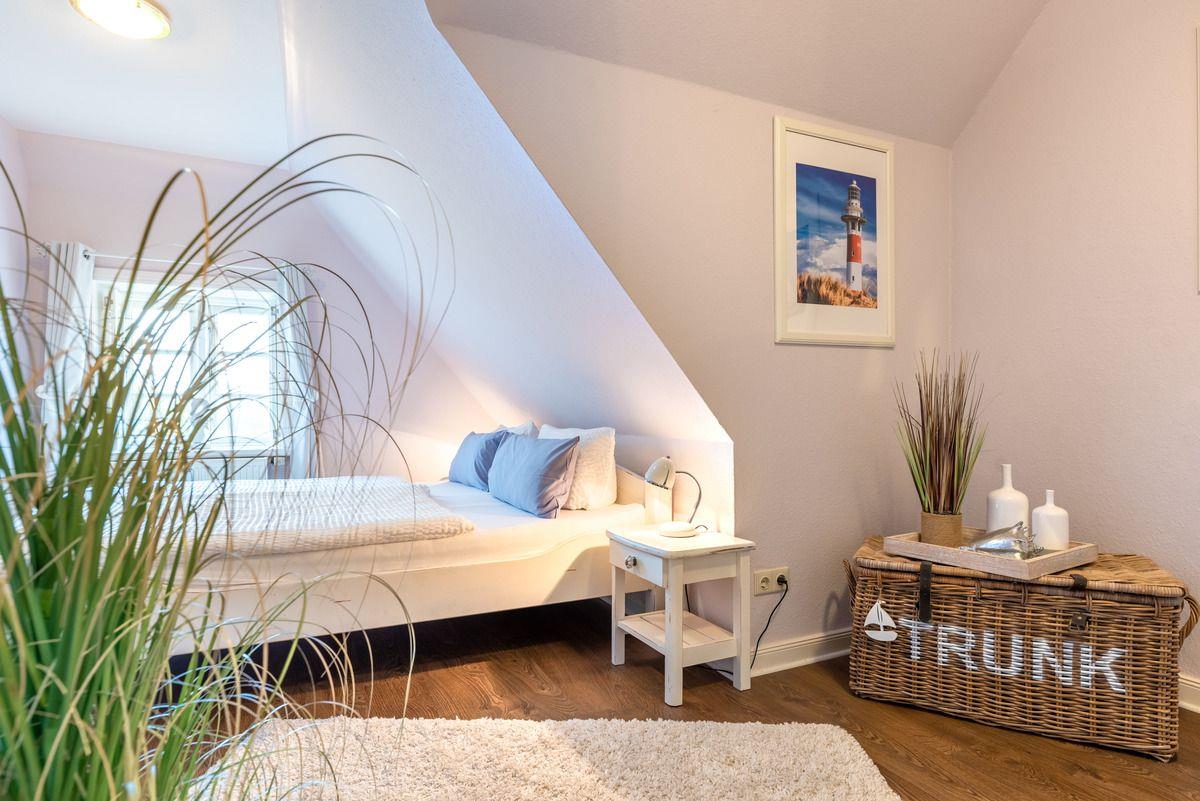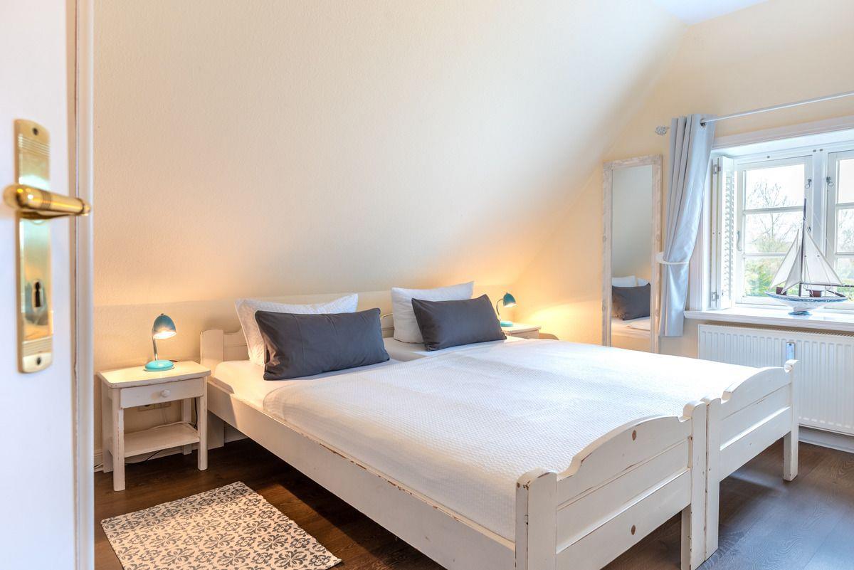 Drei liebevoll gestaltete Schlafzimmer im Obergeschoss sorgen für erholsamen Schlaf. Sie sind mit Verdunklungsplissees ausgestattet. Das Duschbad verfügt über eine Dusch-Badewanne.