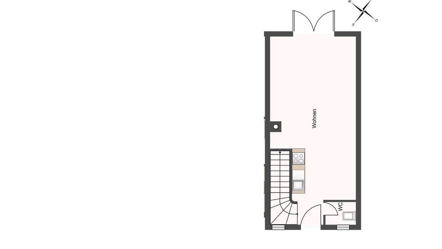 Große Wohnküche mit Terrassenzugang und einem Gäste WC.