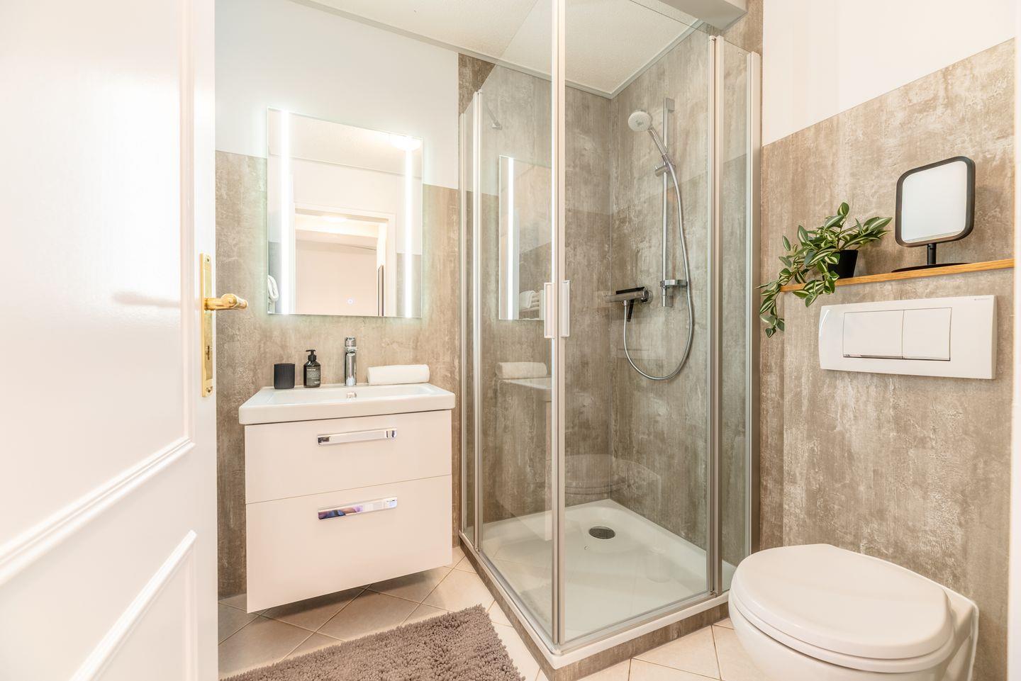Im Oberen Bereich befindet sich ein Schlafzimmer mit Ankleide sowie ein weiteres Schlafzimmer mit einem Einzelbett. Auch ein Duschbadezimmer mit WC ist hier vorhanden.