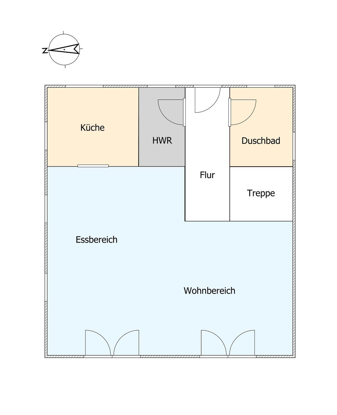Die Unterkunft unter Reet erstreckt sich über die gesamte rechte Haushälfte. Das Herzstück bildet der großzügige Wohn-/Essbereich mit offener Küche und Zugang zur Terrasse. Die Ausstattung ist hochwertig. Die Fußbodenheizung des EGs wird durch zahlreiche Heizkörper ergänzt. Die Küche ist mit Markengeräten der Firma Miele ausgestattet worden, die Möblierung stammt von Rivera Maison sowie Flamant. Ein Apple-TV, zwei Fernseher und ein Musiksystem mit Bluetooth-Funktionen stehen im Bereich Multimedia zur Verfügung. Neben einer Filterkaffeemaschine ist auch eine Nespressomaschine vorhanden. Weiterhin befinden sich im Erdgeschoss ein Badzimmer mit Dusche und ein Hauswirtschaftsraum, in welchem Waschmaschine und Trockner zu finden sind.