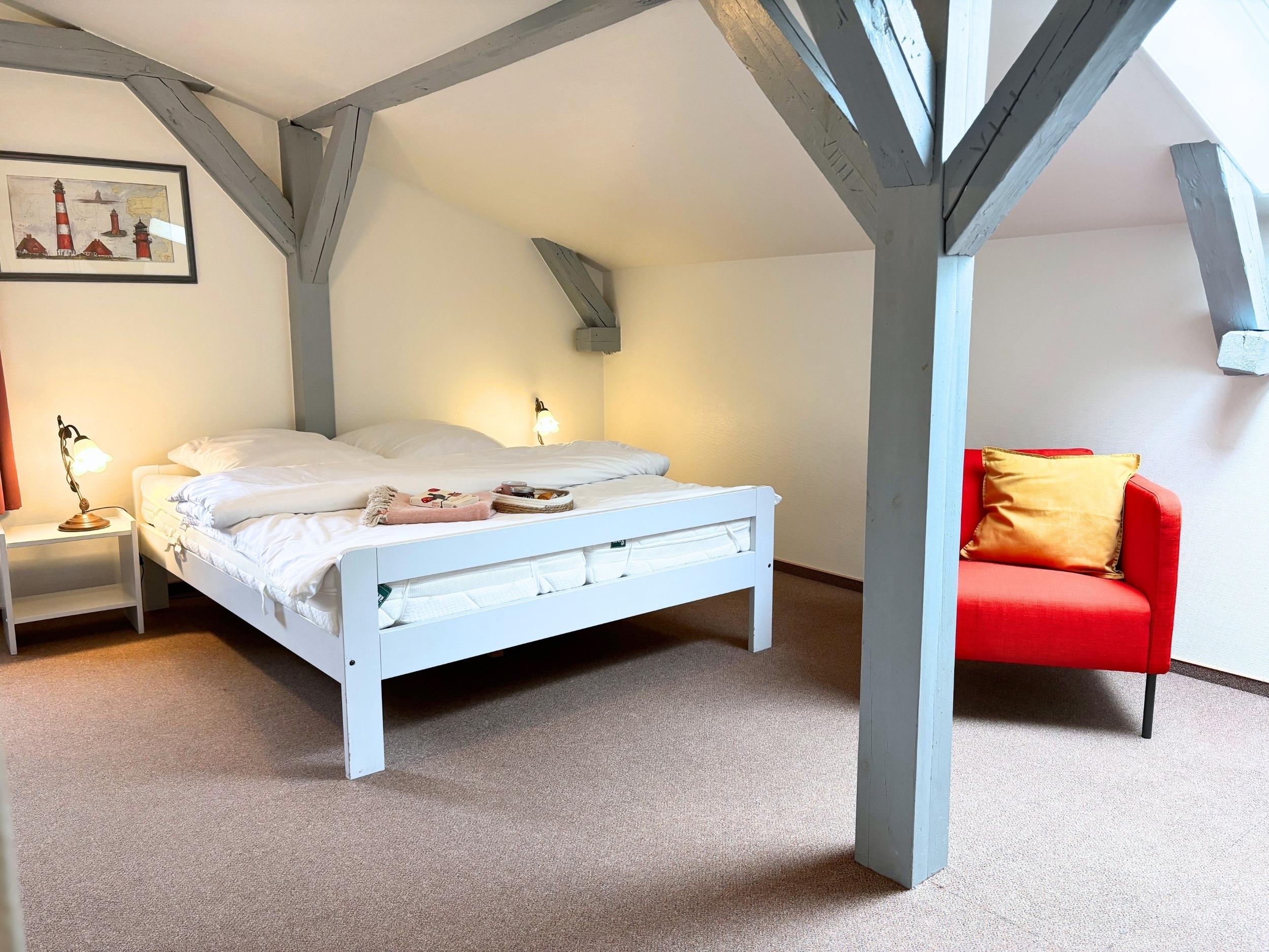 Die Kleene Helene ist unser kleines Kuschelapartment. Die charmante 1-Raumwohnung befindet sich im Obergeschoss des alten Bauernhauses. Sie ist wohl die gemütlichste unserer Ferienwohnungen. Klein aber fein. Perfekt für eine Auszeit zu zweit.