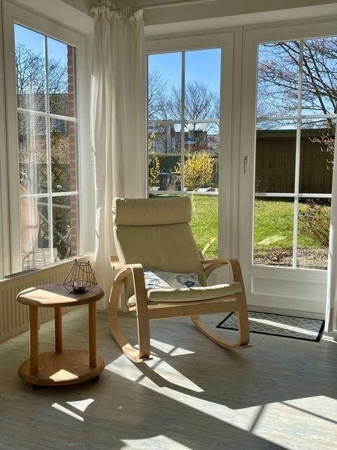 Der südwestlich ausgerichtete, helle, frisch renovierte Wohn-/ Essbereich ist mit Sofaecke, Schaukelstuhl, Sitzecke und Esstisch ist für 4 Personen plus Kinderhochstuhl ausgestattet. WLAN, Satelliten-TV sowie CD-Radio sind vorhanden. In den Schränken befinden sich Spiele, Bücher und Informationsmaterial über die Insel sowie die Freizeitmöglichkeiten.