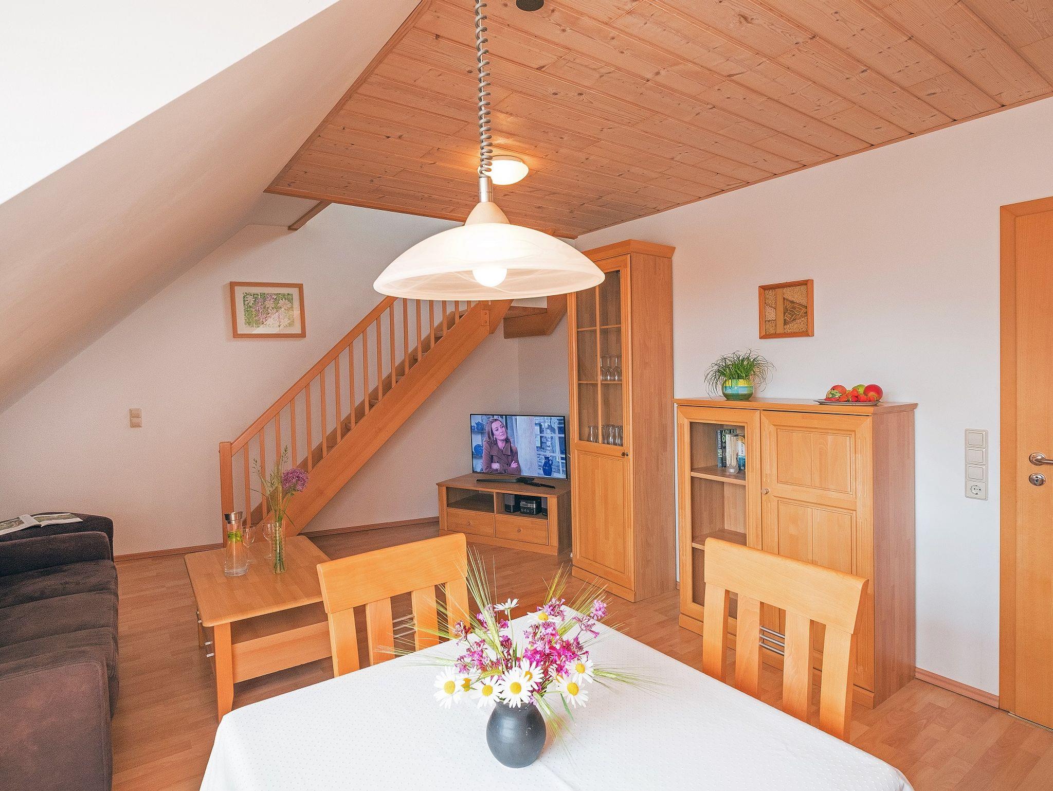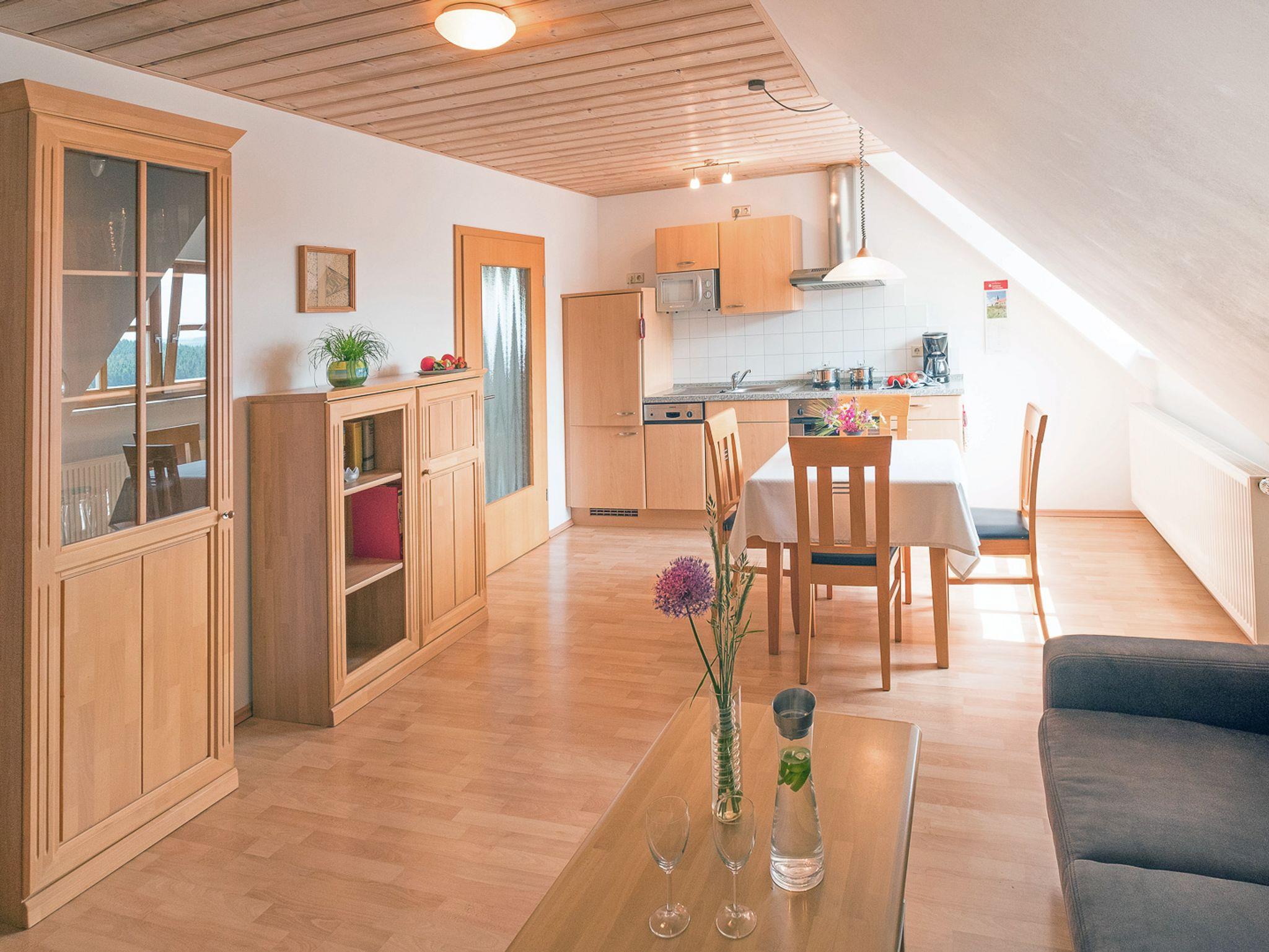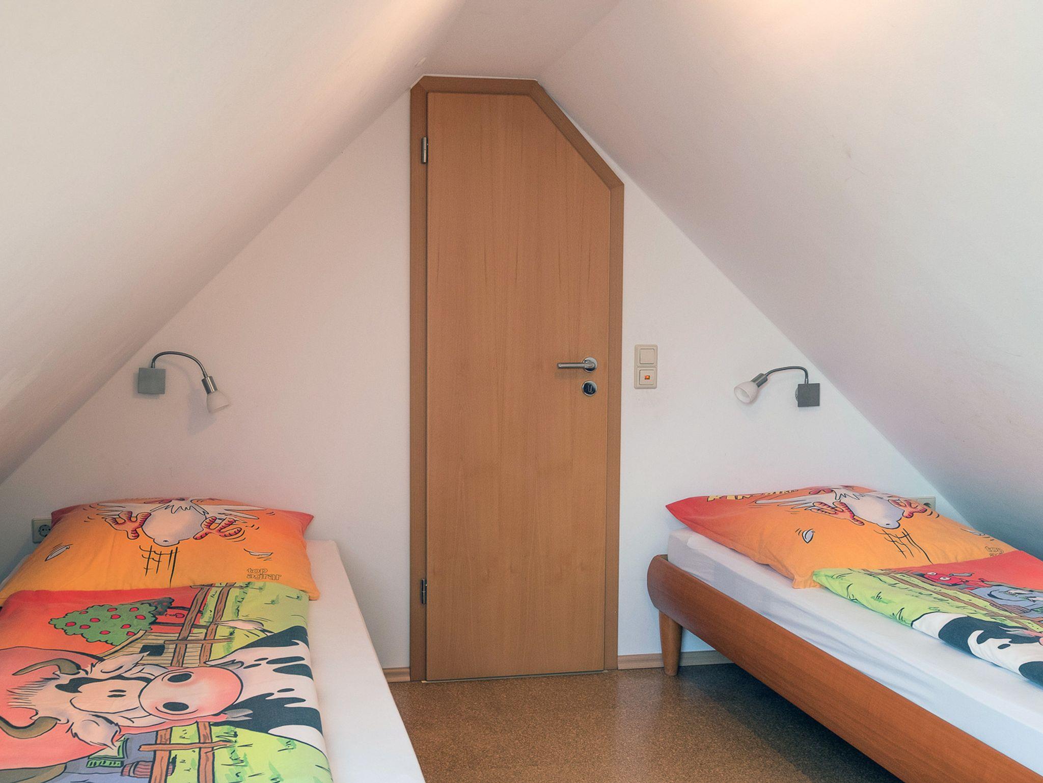 Unsere gemütliche Ferienwohnung 5 liegt im Dachgeschoss. Ein ganz besonderes Extra wartet hier auf die Kinder: Sie haben ihren eigenen Schlafbereich und ihr eigenes WC eine Etage höher, direkt unter dem Dach. Im großzügigen Wohnbereich verläuft die Treppe in das Domizil der Kinder nach oben. Die Küche ist komplett ausgestattet (z.B. Mikrowelle, Geschirrspüler, Wasserkocher, Ceran-Kochfeld). Im weiteren Schlafzimmer ist viel Platz, so dass wir auch bequem ein Kinderbettchen für die Kleinsten unterbringen. Das Bad mit Dusche und WC ist gleich daneben. Auf WLAN müssen sie auch hier nicht verzichten.