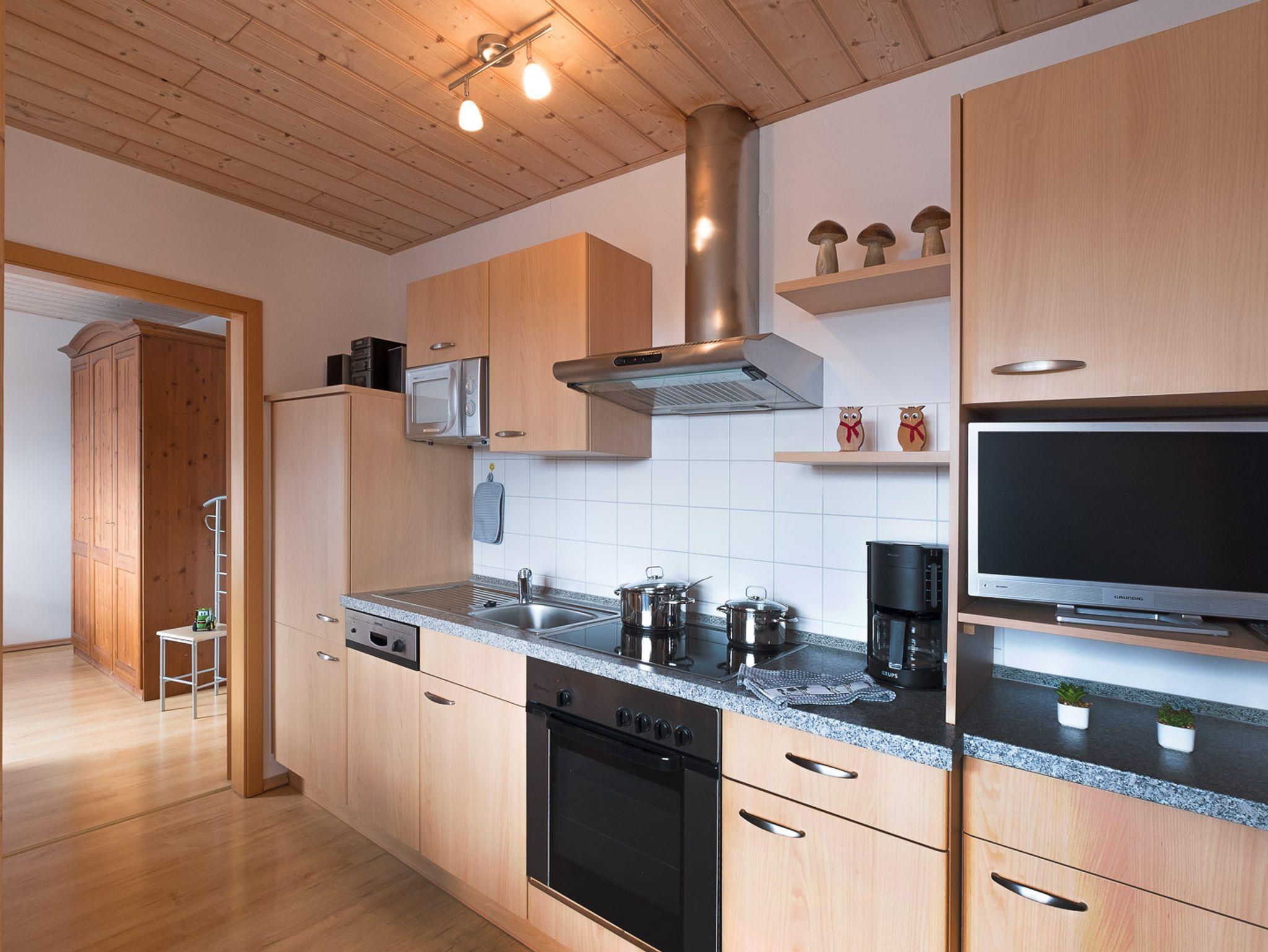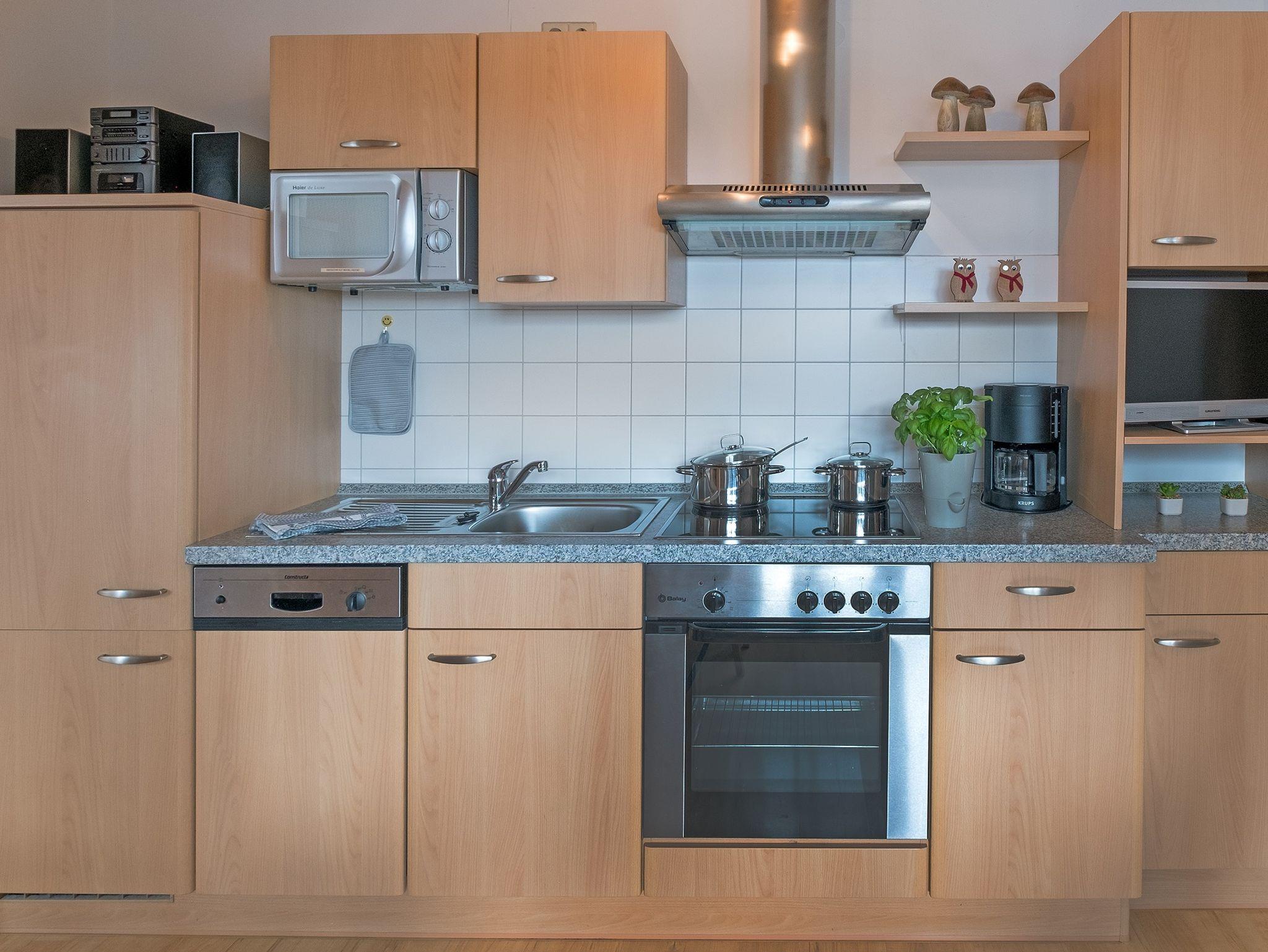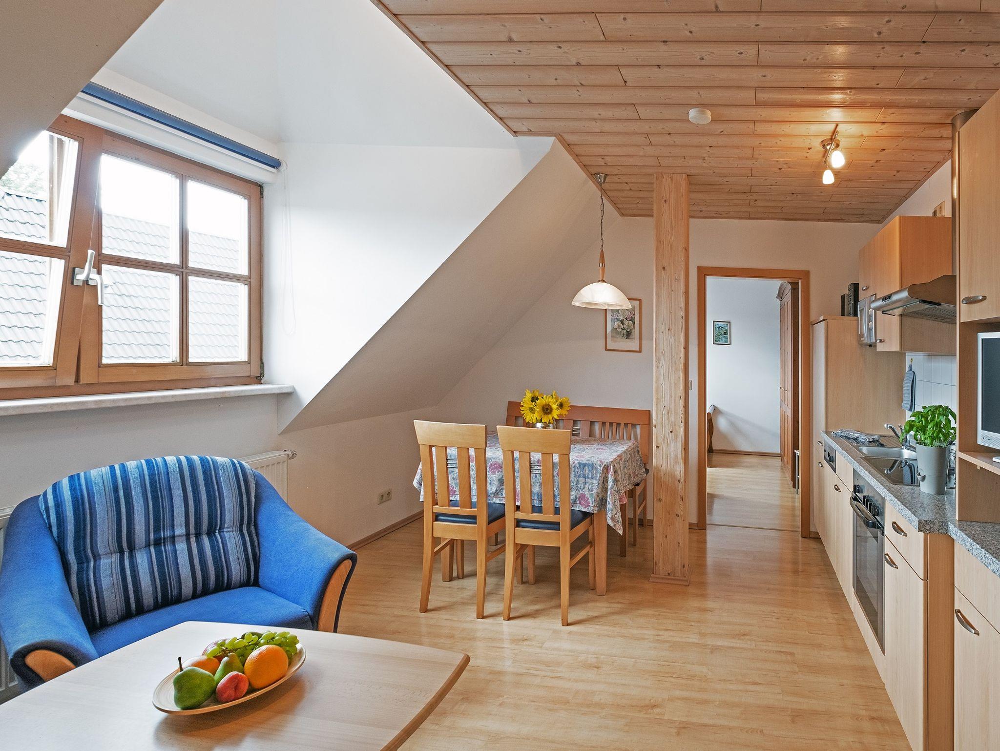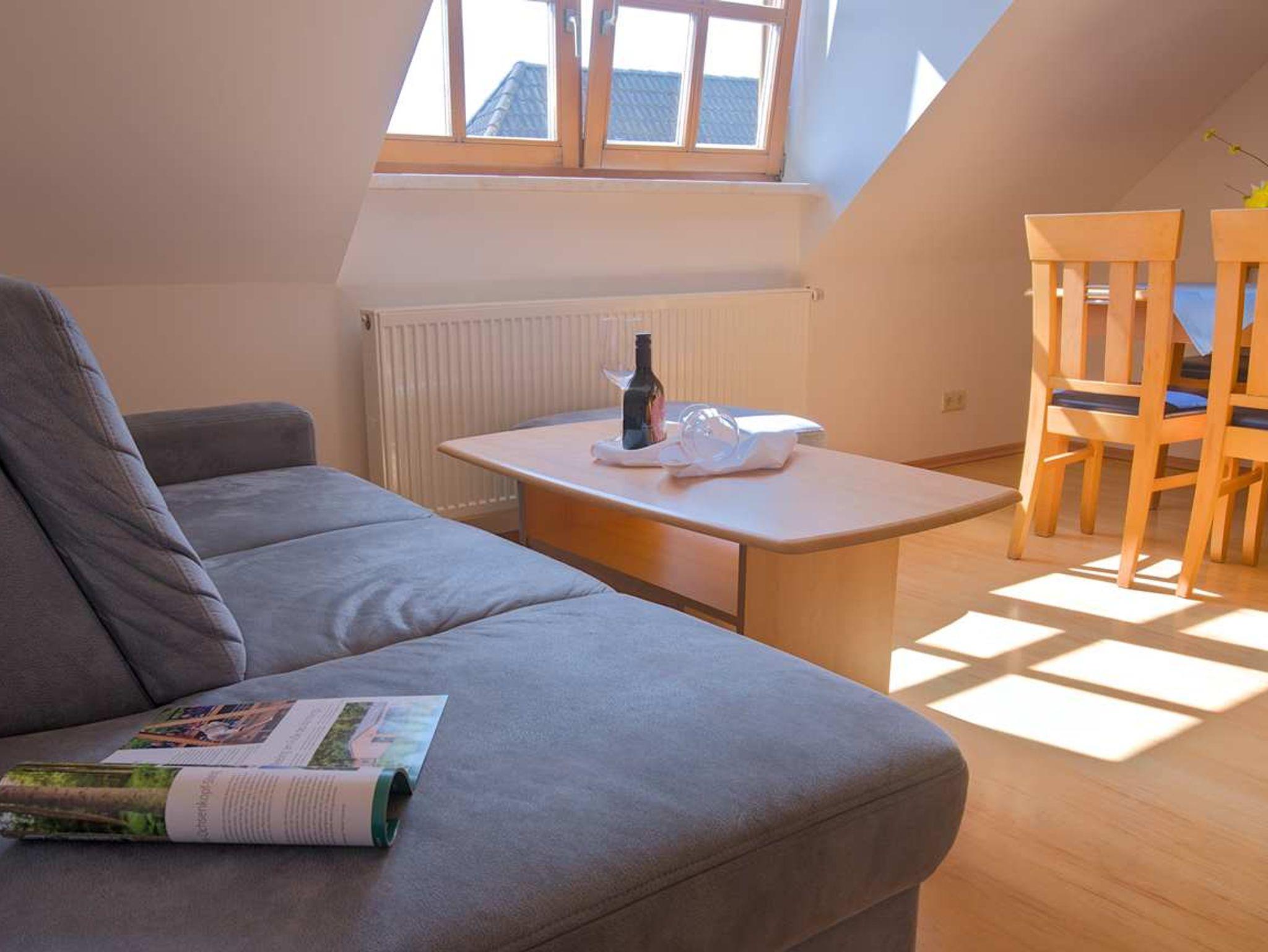 Unsere moderne Wohnung 6 befindet sich im Dachgeschoss. Zwei großzügige Schlafzimmer (Doppelbett, getrennte Betten) bieten auch Platz für ein Kinderbettchen. Die Küche ist komplett ausgestattet (z.B. Mikrowelle, Geschirrspüler, Wasserkocher, Ceran-Kochfeld) und im gemütlichen Essbereich sitzt man gerne beieinander. Sofa, Sessel und TV sind natürlich ebenfalls vorhanden. Dusche und WC sind getrennt und im Eingangsbereich können Jacken und Schuhe abgelegt werden. WLAN