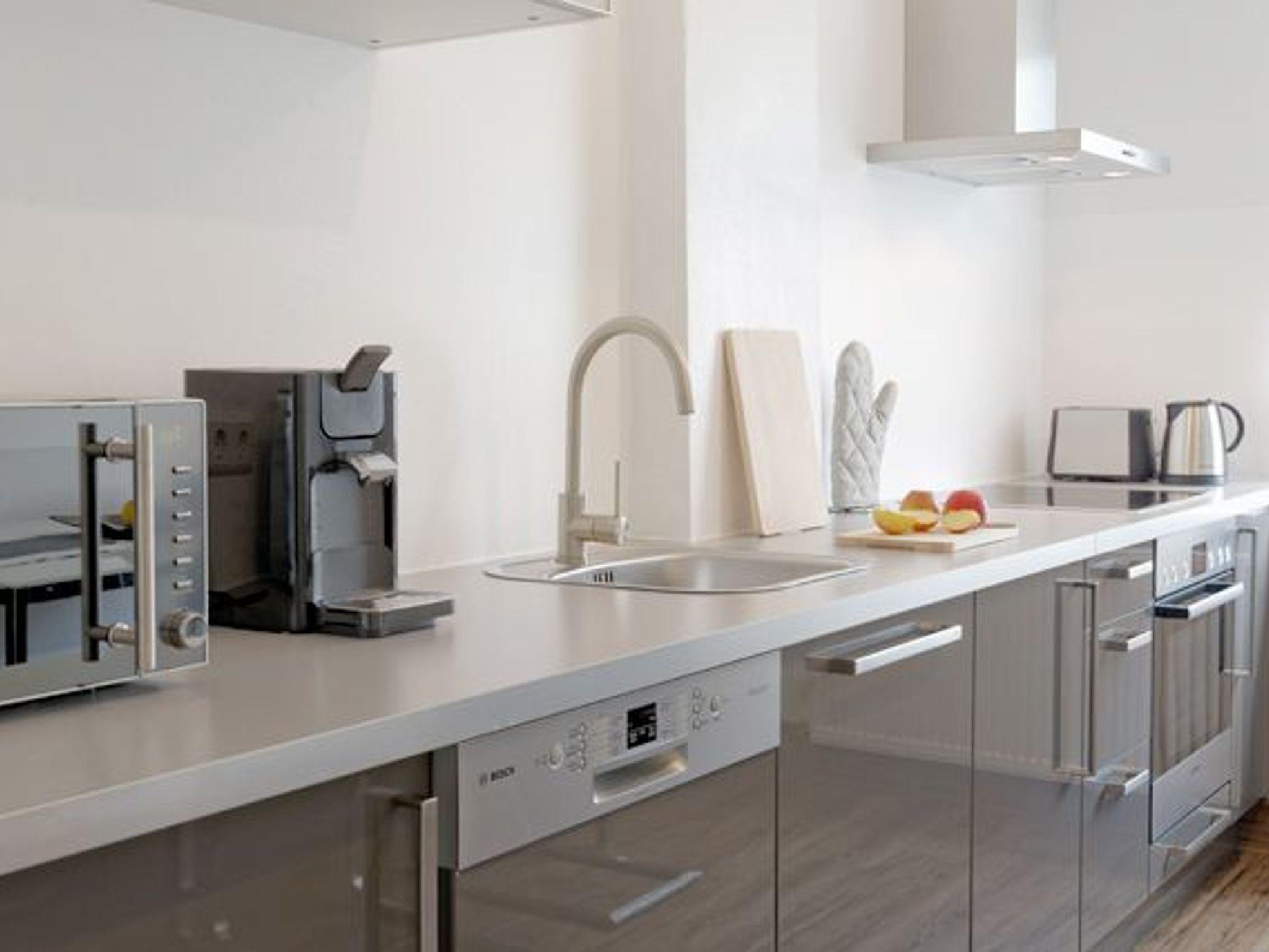 - Küche mit Essplatz mit Mikrowelle, Herd, Geschirrspüler, Toaster, Kaffeemaschine