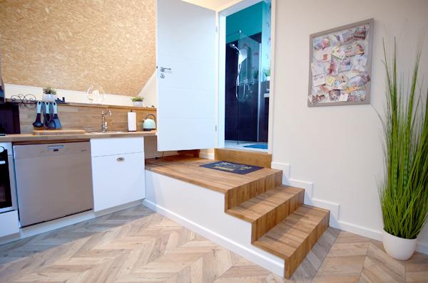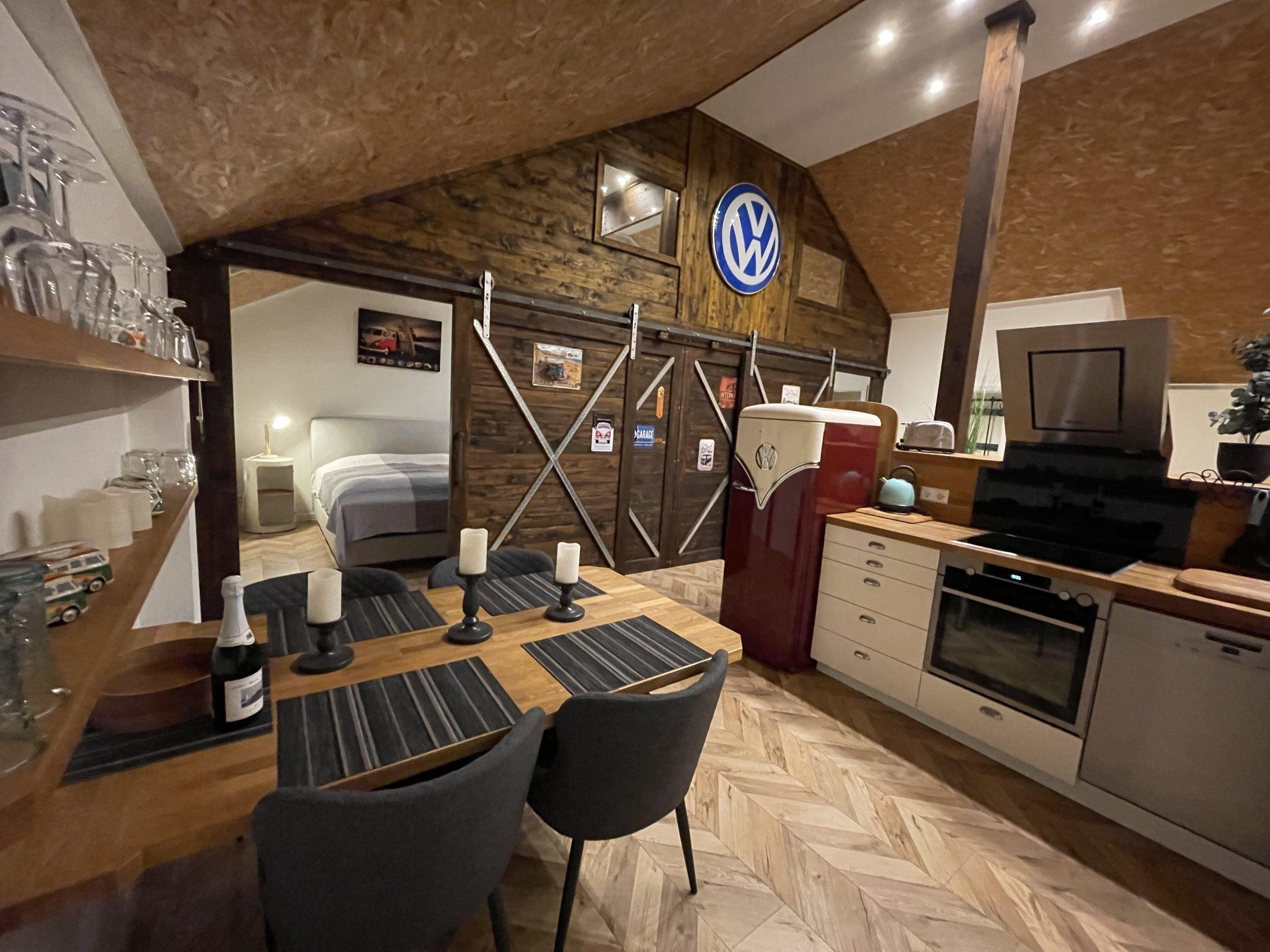 Zur Küche gehört außerdem eine Grundausstattung zum Kochen, Geschirr und Besteck, Edelstahl-Backofen, Weingläser, Backblech. Ein Esstisch ist auch vorhanden.