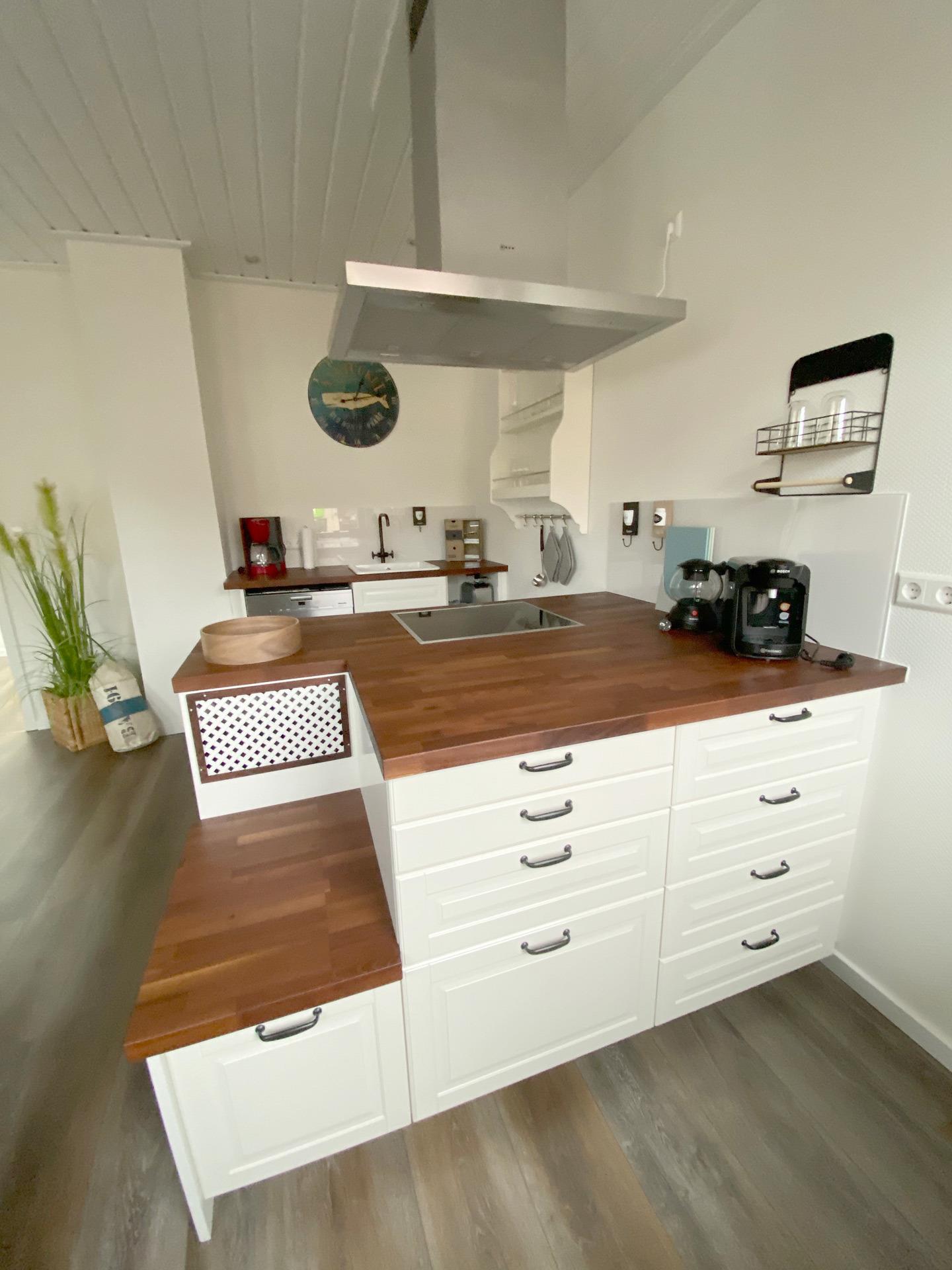 Zur Küche gehört außerdem eine Grundausstattung zum Kochen, Geschirr und Besteck, Edelstahl-Backofen, Weingläser, Backblech. Ein Esstisch ist auch vorhanden.