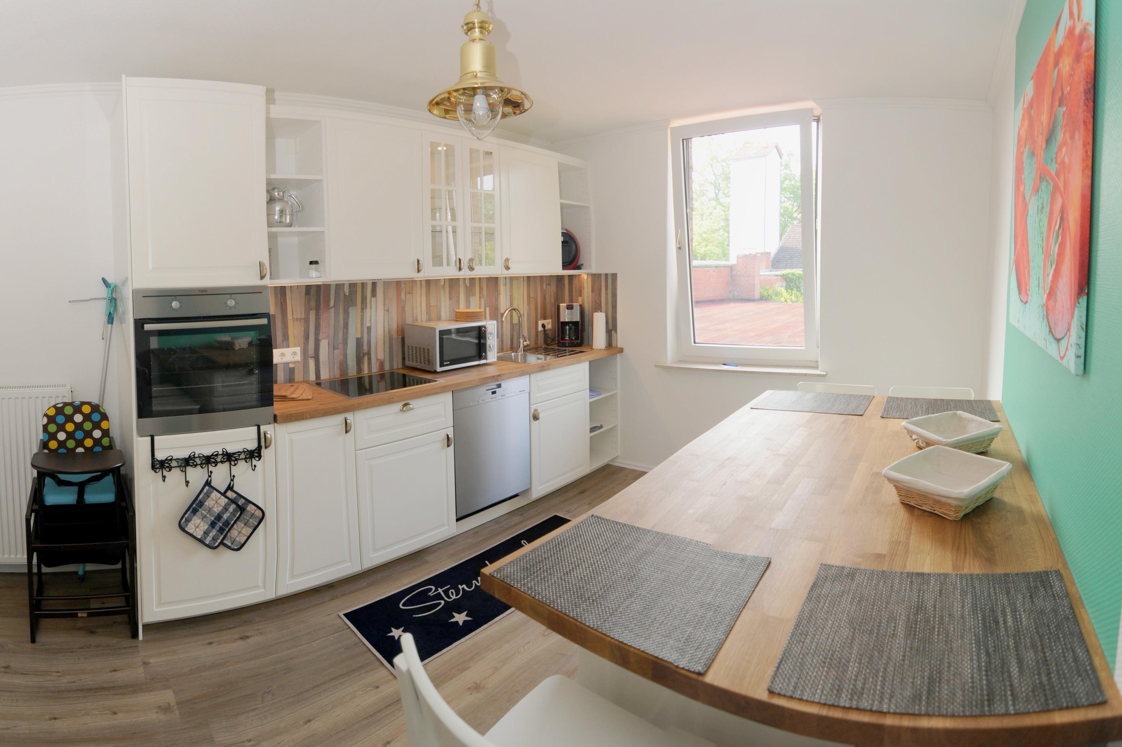 Zur Küche gehört außerdem eine Grundausstattung zum Kochen, Geschirr und Besteck, Edelstahl-Backofen, Weingläser, Backblech. Ein Esstisch ist auch vorhanden.