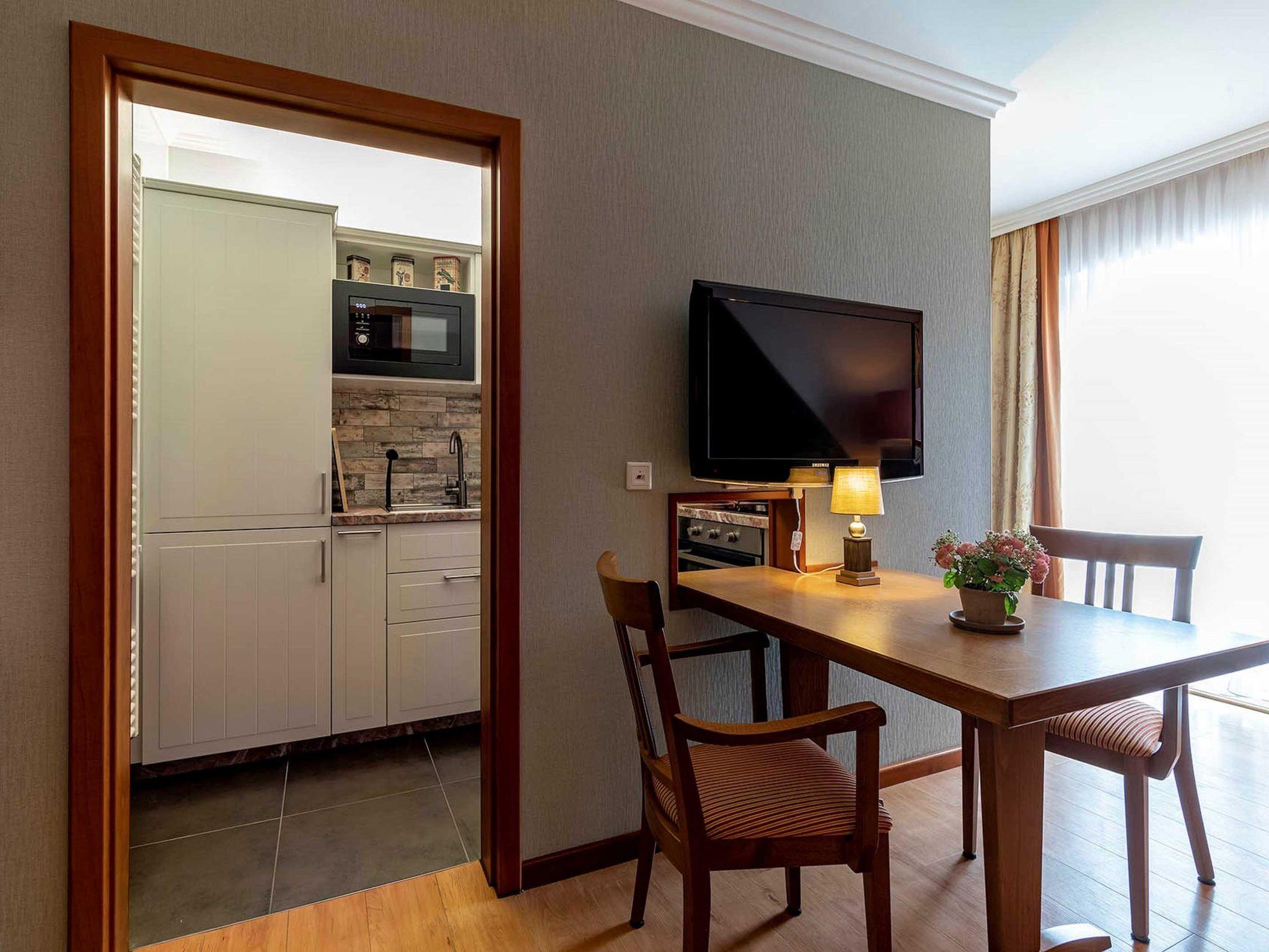 Der Flur mit Garderobe und Wandschrank teilt die Wohnung in ein Schlafzimmer mit angeschlossenem Bad und ein Wohnzimmer mit voll ausgestatteter Kitchenette, Esstisch und direktem Zugang zum Balkon.