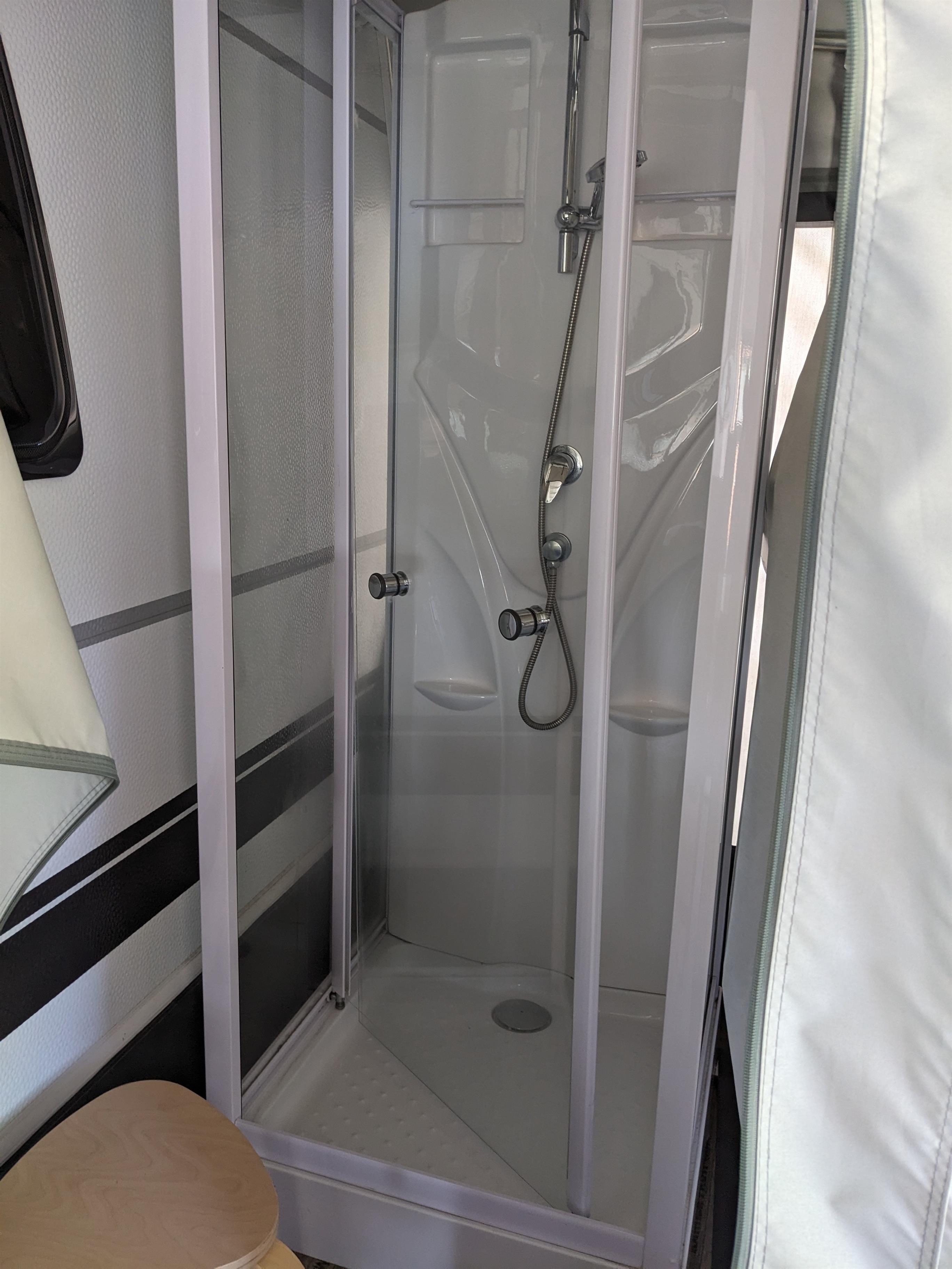 Unsere Luxusmietwohnwagen sind mit einer Dusche und einer festen Toilette ausgestattet - mit direktem Anschluss an die Kanalisation. Dadurch muss nichts entleert werden. Er befindet sich direkt am See.