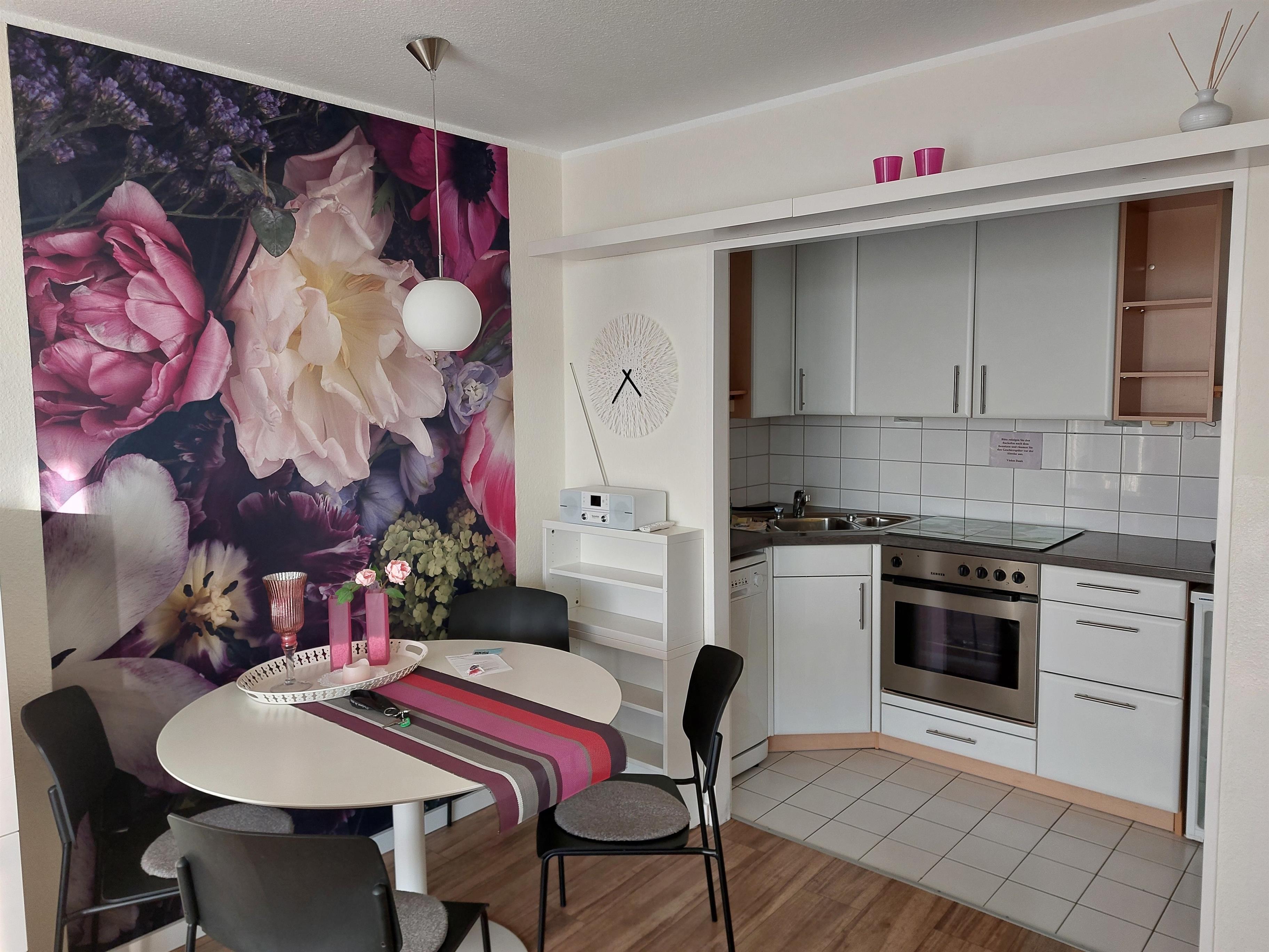 In der gut ausgestatteten Küche finden Sie u.a. einen Kühlschrank mit kleinem Gefrierfach, 4-Platten-Herd, Backofen, Mikrowelle, Kaffeemaschine und Pad-Kaffeemaschine, Wasserkocher und Toaster. Ein Geschirrspüler rundet die Aussstattung in der Küche ab.