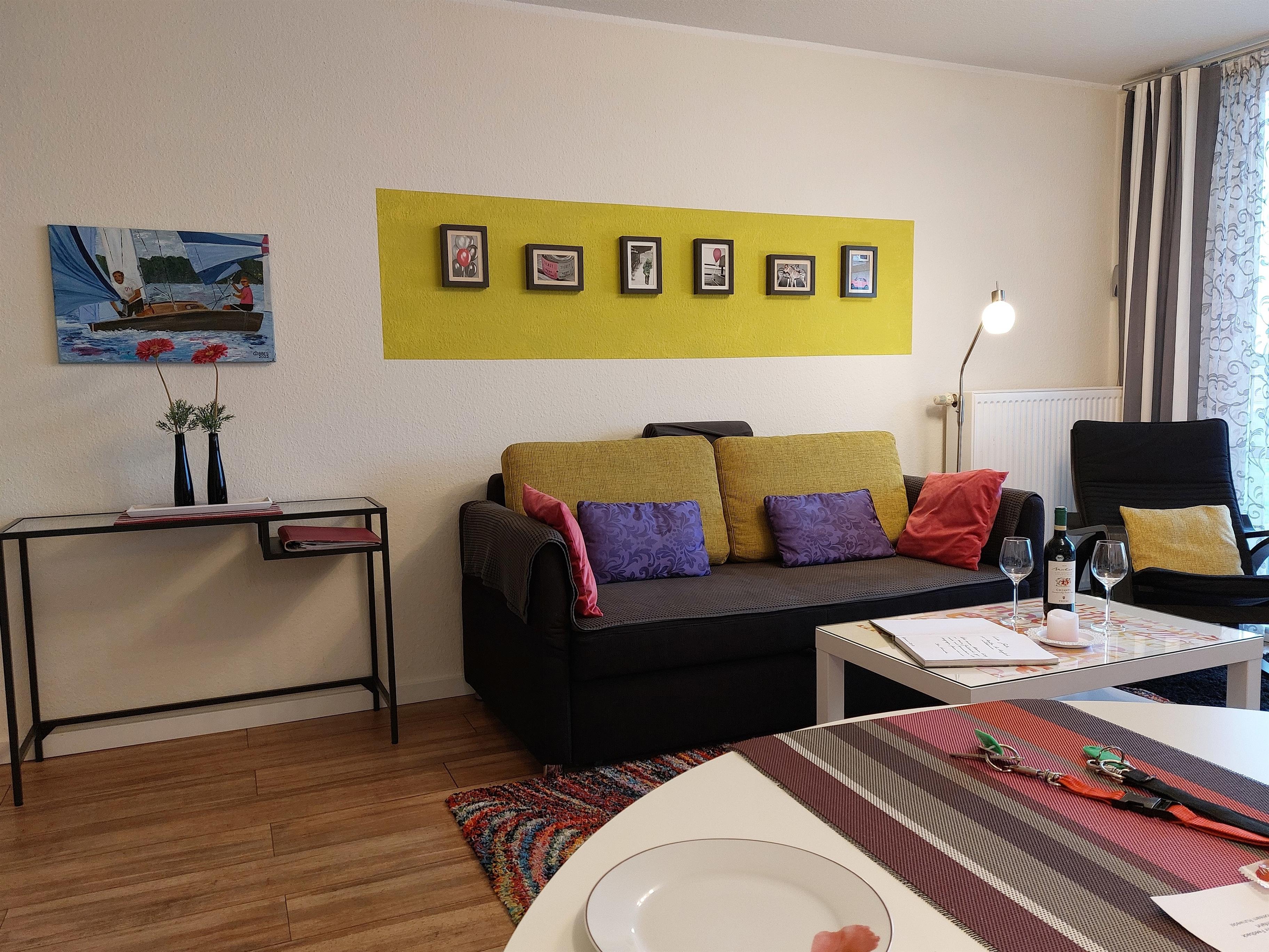 Ihre Ferienwohnung im ersten Stock ist 45qm groß und kann mit drei Personen belegt werden. Sie ist modern in freundlichen Farben eingerichtet und besteht aus einem Wohnraum mit Essecke und Küchenzeile, Badezimmer mit Dusche und Schlafzimmer.
