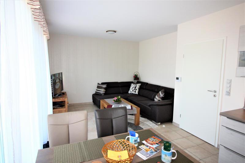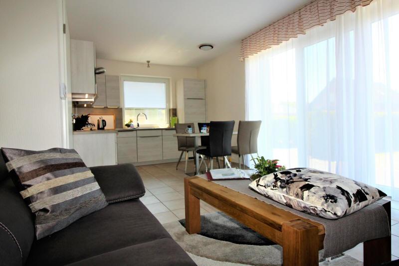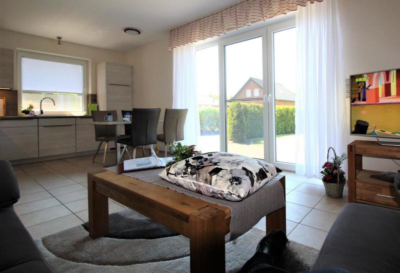 Der Wohn- Essraum hat eine gemuetliche Einrichtung mit SAT TV. Die Kuechenzeile ist mit einem Cerankochfeld, Geschirrspueler, Backofen, Waschmaschine und Kuehlschrank mit Gefrierfach ausgestattet. Im Elternschlafzimmer befindet sich ein Doppelbett (160 cm x 200 cm) mit Kleiderschrank . der PKW steht im Carport