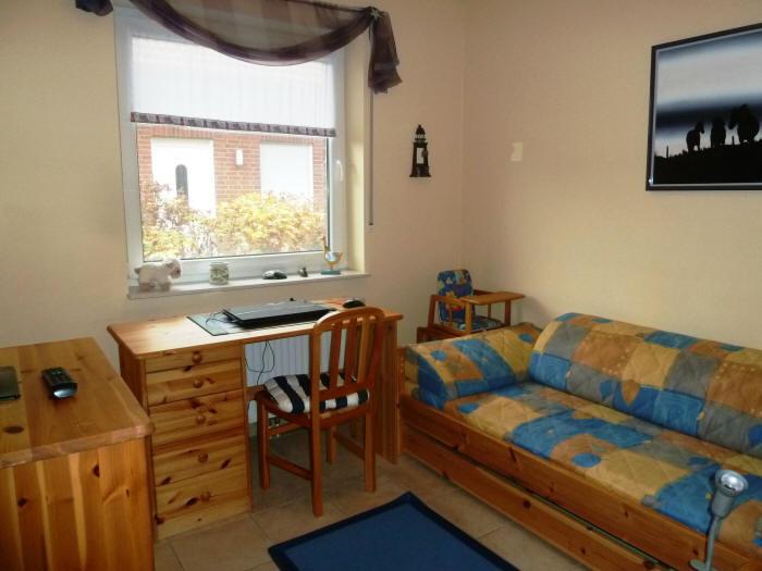 In einem der zwei Kinderzimmer, jeweils mit Bett, befindet sich ebenfalls ein SAT TV und ein Schreibtisch: