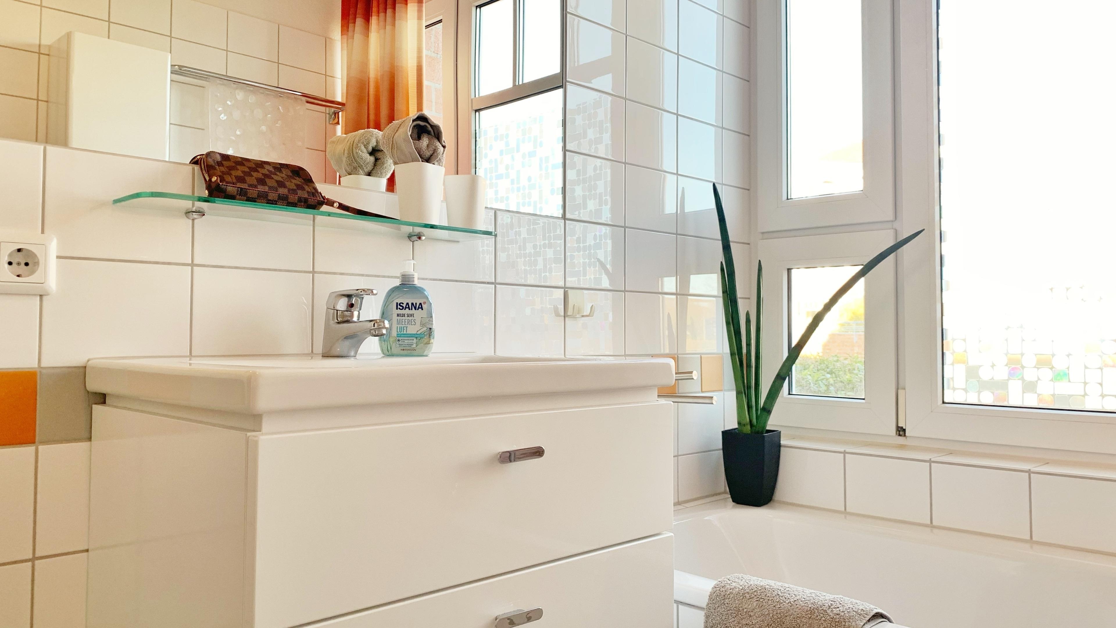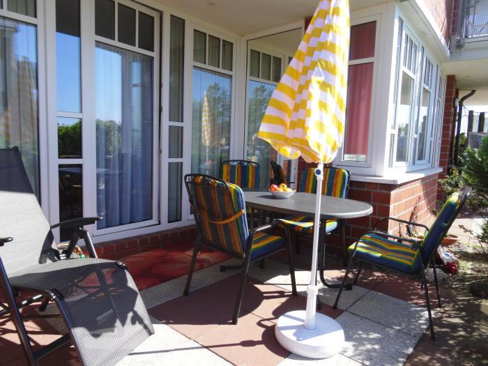 Ein Schlafzimmer mit Doppelbett und ein Kinderzimmer mit Hochbett (2m x 90 cm) bieten Platz für 4 Personen. Beide Schlafzimmer sind mit Kleiderschrank bestückt. Zusätzliche Decken und Kopfkissen auf Wunsch vorhanden. Terrassenbestuhlung vorhanden. Das helle Badezimmer verfügt über Badewanne und Dusche. Nichtraucherwohnung. PKW-Stellplatz vorhanden.