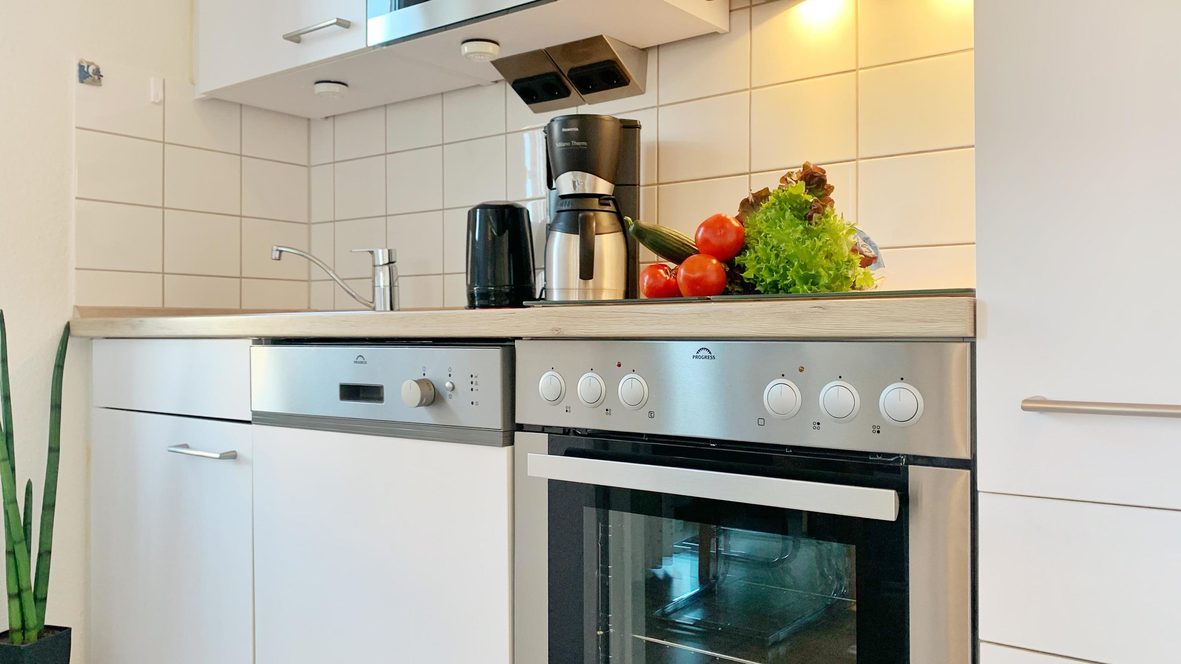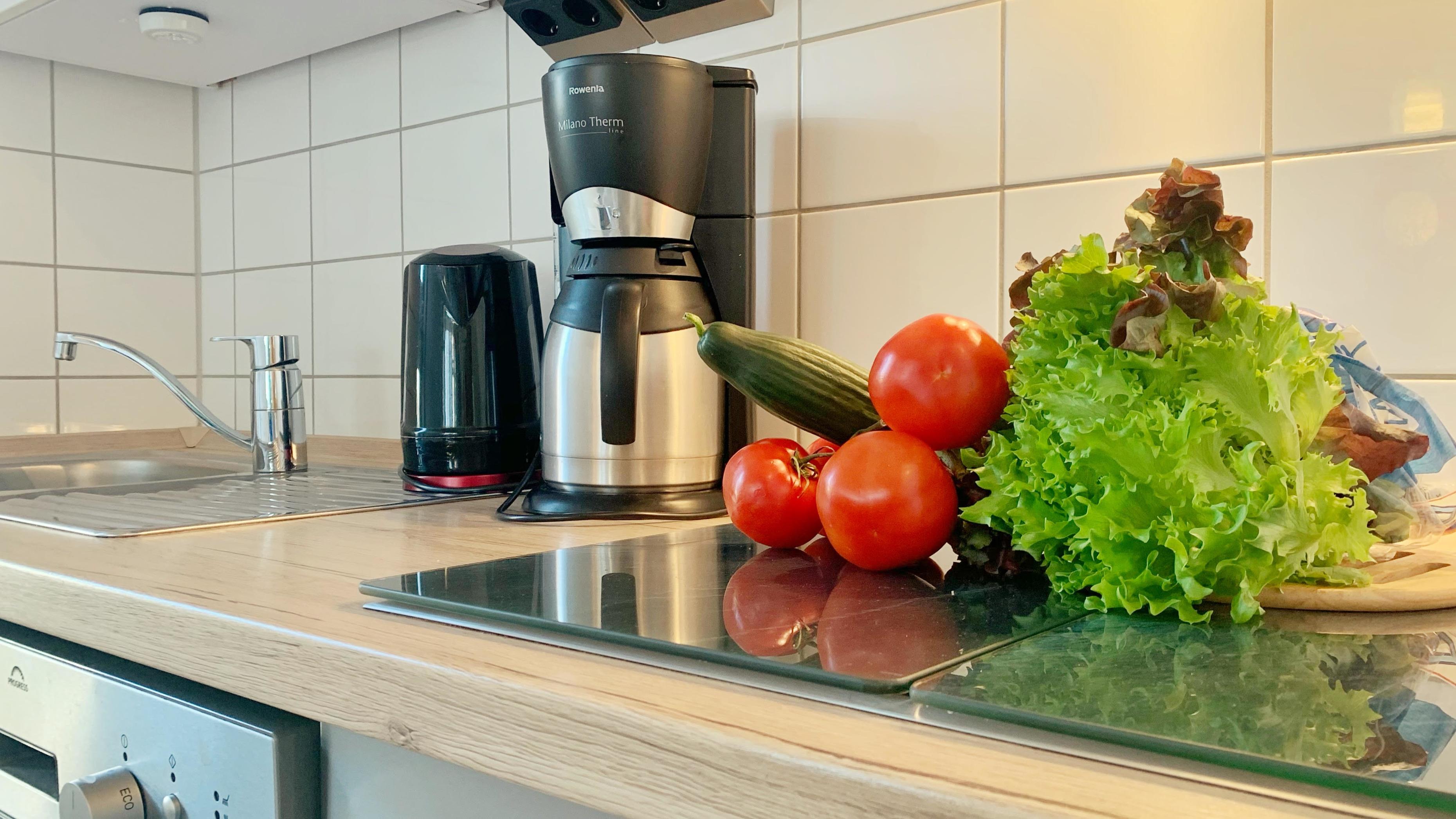 ( 2 Erw. im Elternschlafzimmer) und 2 Kinder Im Kinderzimmer (Hochbett) ausgerichtet bzw. für 4 Personen (2 Erw/2 Kinder) und ein Kind im Kinderreisebett. Das neue Wohnzimmer ist mit einer Essgruppe für 4 Personen ausgestattet. Ein Flachbildfernseher an der Wand mit 102 cm Diagonale wartet auf Ihre Nutzung. Die Küchenzeile ist komplett neu und mit Glaskeramik-Kochfeld, Herd, Backofen, Mikrowelle, Wasserkocher, Toaster, Kaffeemaschine, Eierkocher, Mixer, Stabmixer und Kochtöpfen, Geschirr und Geschirrspüler eingerichtet.
