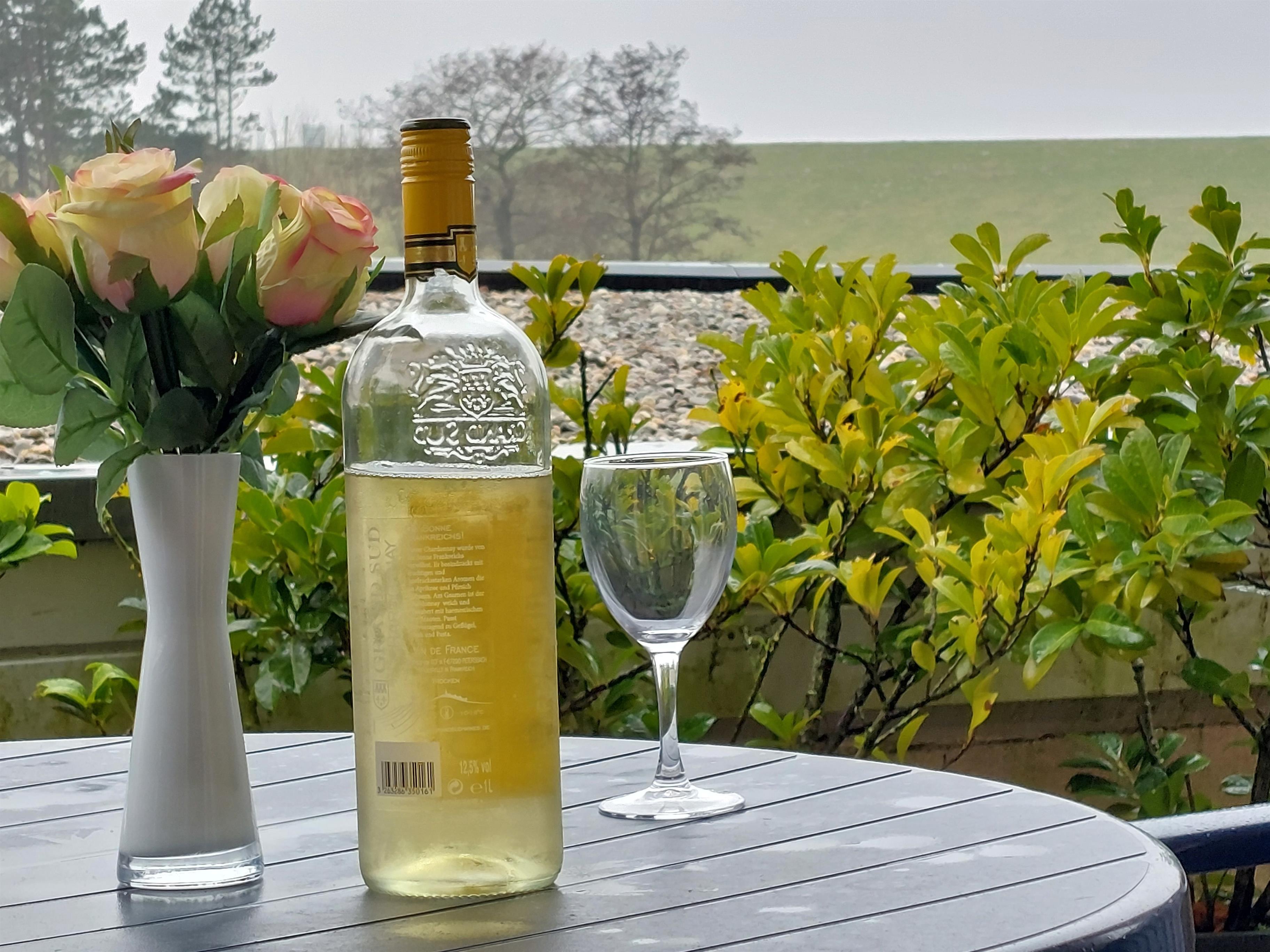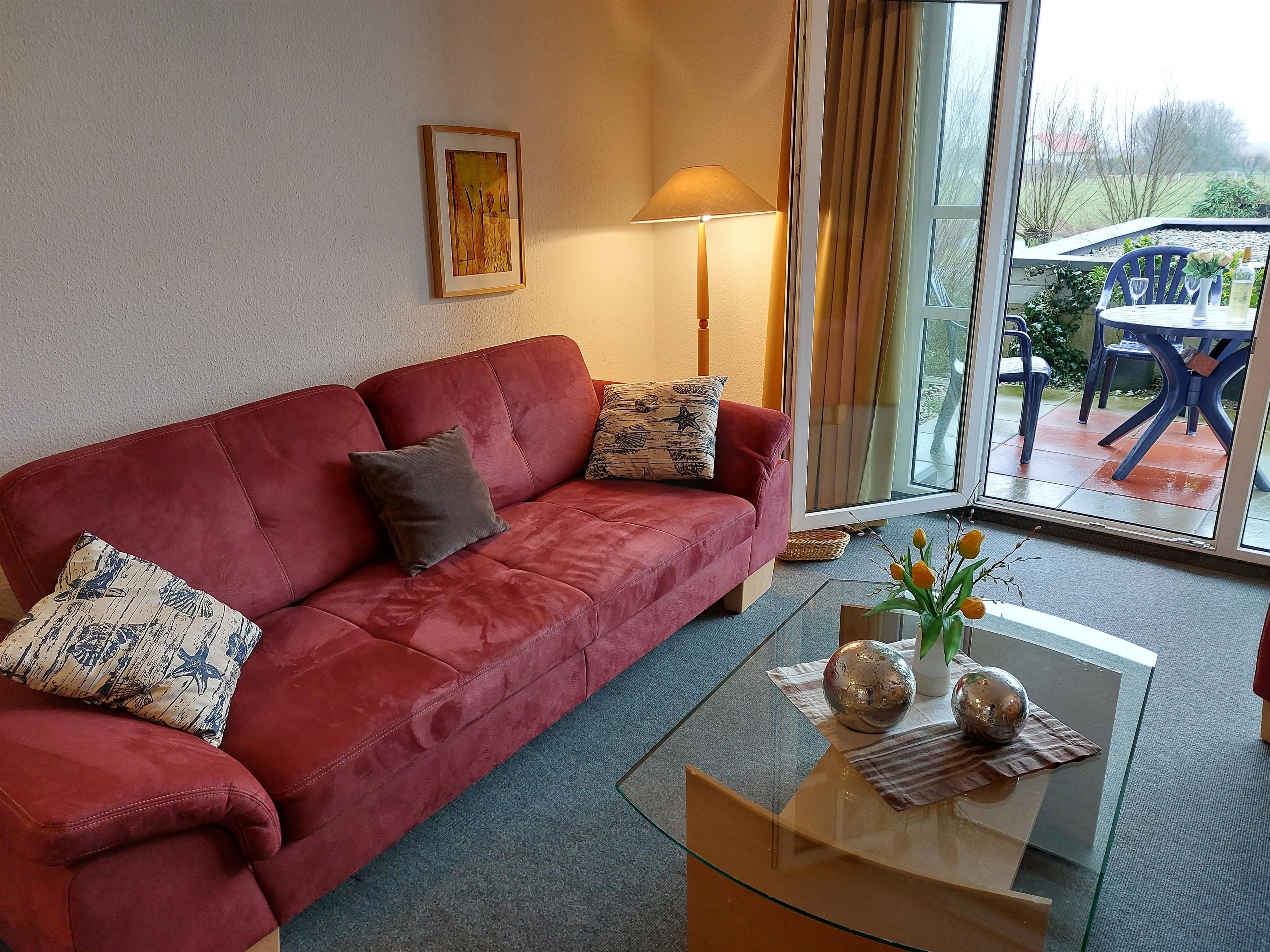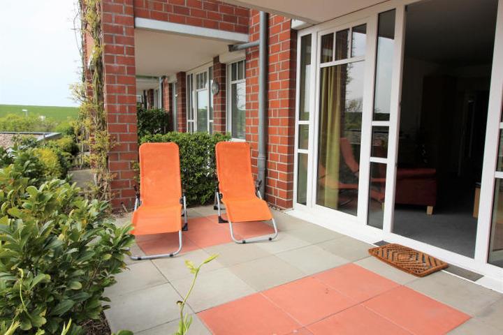 Von der Terrasse aus blicken Sie auf den Nordseedeich. Terrassenbestuhlung vorhanden mit 2 Liegen.