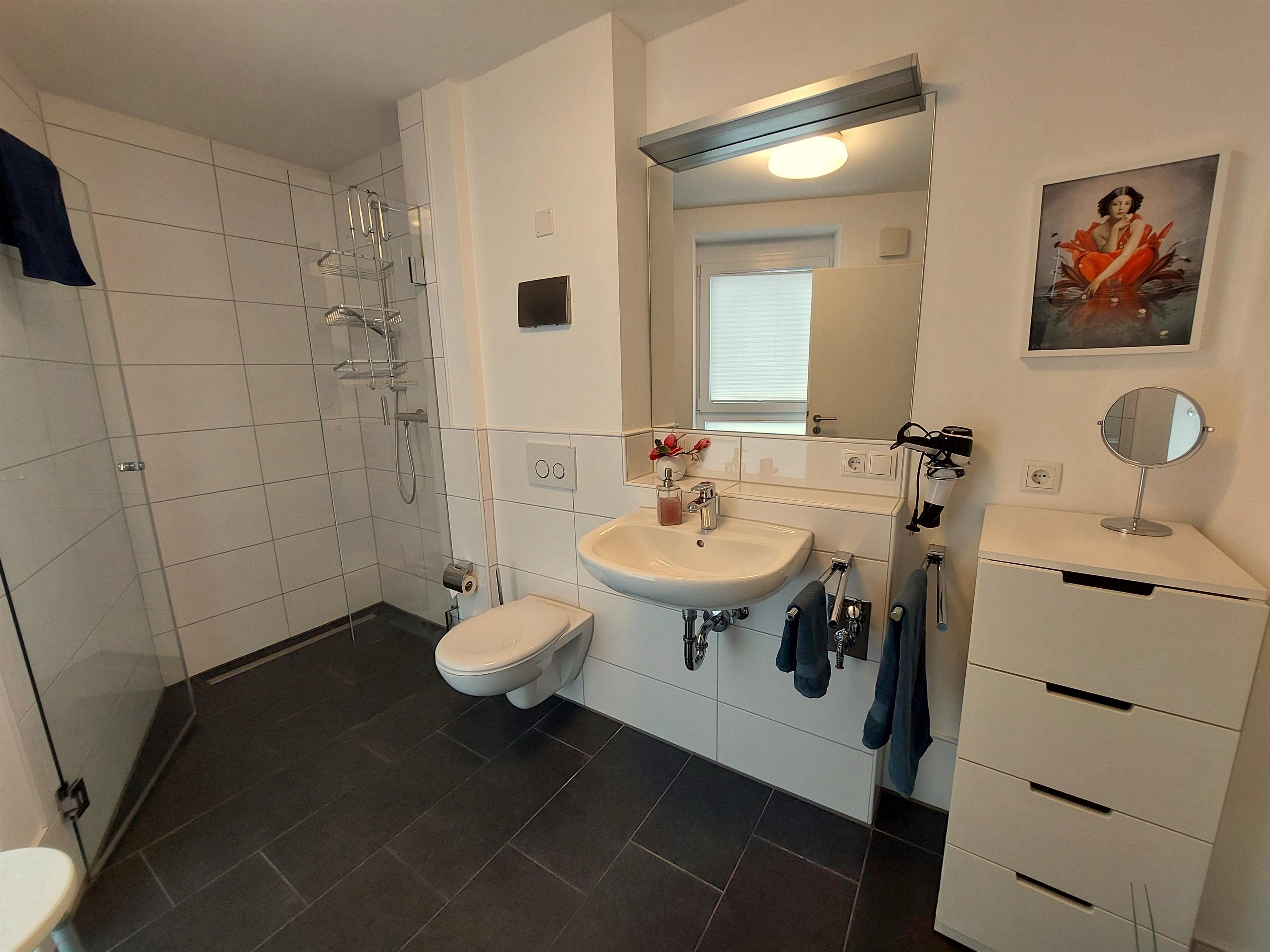 Das helle Badezimmer verfügt über eine bodengleiche Dusche. Nichtraucherwohnung. PKW-Stellplatz vorhanden.