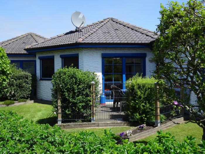 Ein Achteckreihenbungalow (ca. 58 m²) für 4 Personen, z.B. 2 Erwachsene und 2 Kinder. Vom großzügigen Wohn-Essraum geht es direkt zur Terrasse in Südlage. Terrasse eingezäunt - siehe Foto