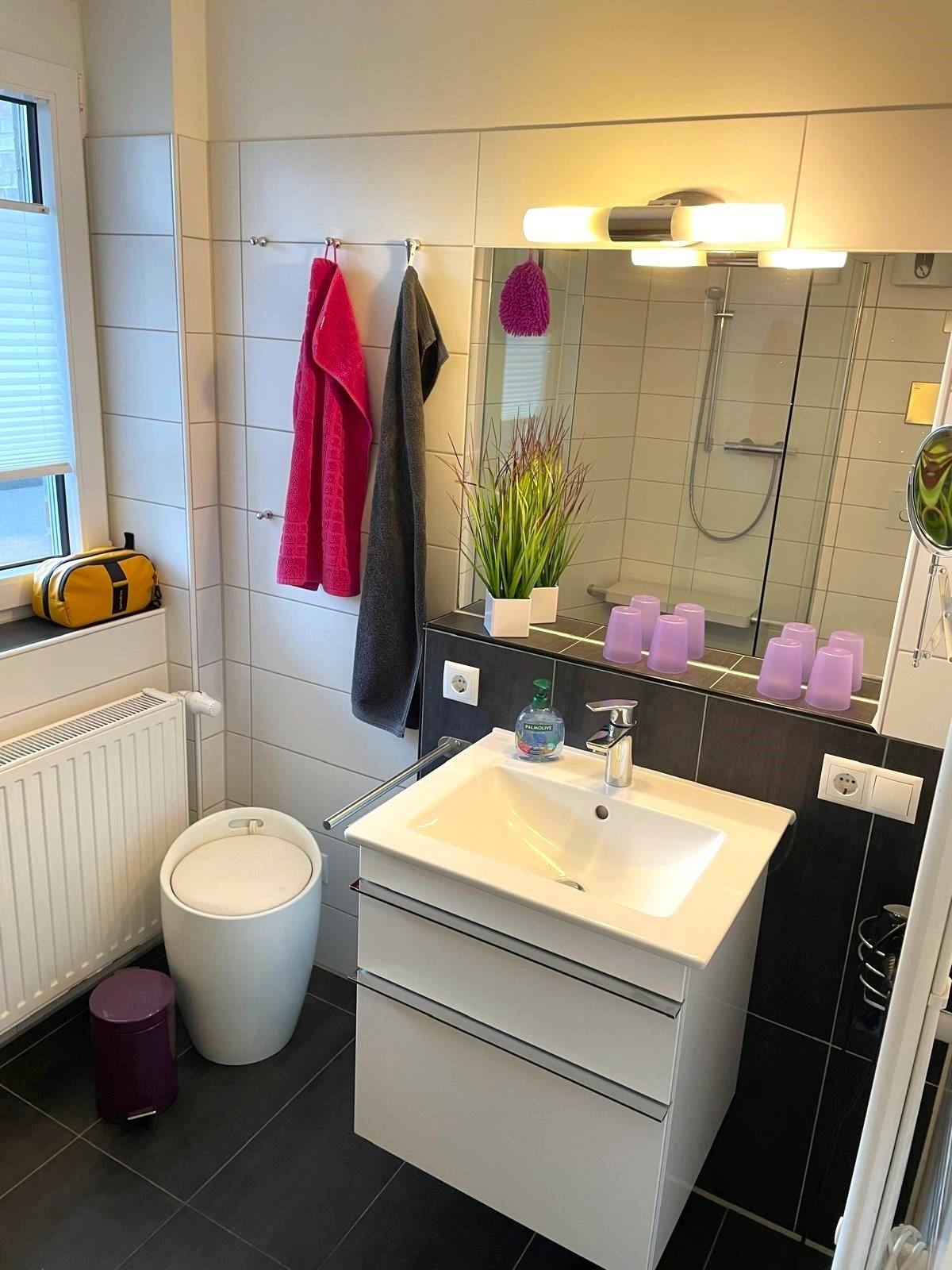 Tageslichtbad mit bodengleicher Dusche. Sehr gute Ausstattung der Küche ( auch Senseo-Kaffeebereiter) und dem angrenzenden Sitzbereich, Bücher und Spiele, DVD's und CD's, Schreibtisch, auch als Spieltisch nutzbar im kleinen Zimmer, Fliegengitter und Jallousien in allen Räumen.