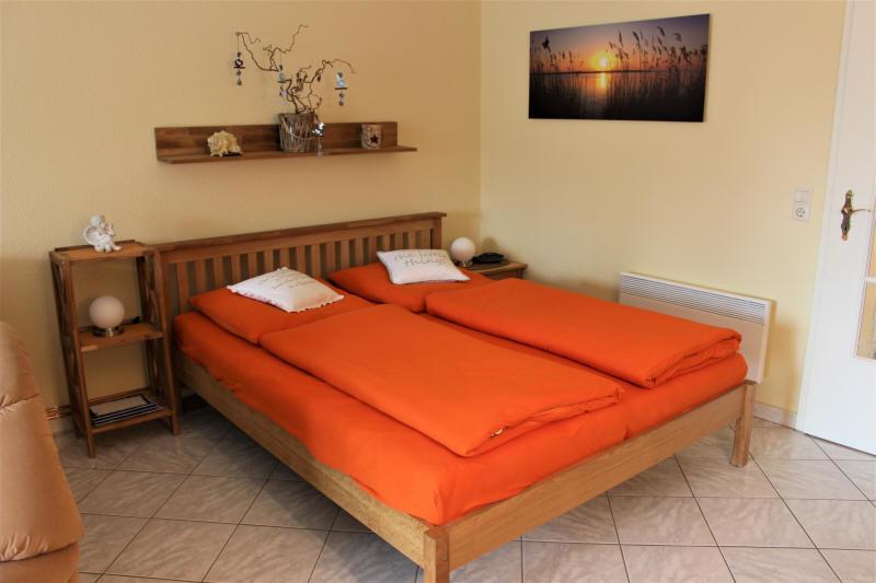 1 Raum-Ferienwohnung mit Bad und separater Kueche. Bett 160 mal 200 cm, 2 Matratzen. Dusche/WC.