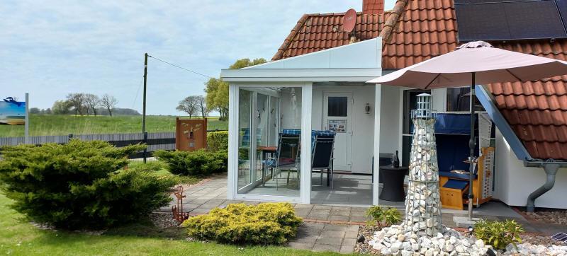 Auf der überdachten und windgeschützten Terrasse stehen Gartenmöbel und ein Strandkorb auf Rollen. Zusätzliche Stühle, Polster, Liegen, ein Weber-Kugelgrill und ** 2 Klappräder ( Nutzung auf eigene Gefahr ) ** stehen im linken Teil des Gartenhauses zur Nutzung bereit. Hier ist auch Platz für mitgebrachte Fahrräder.