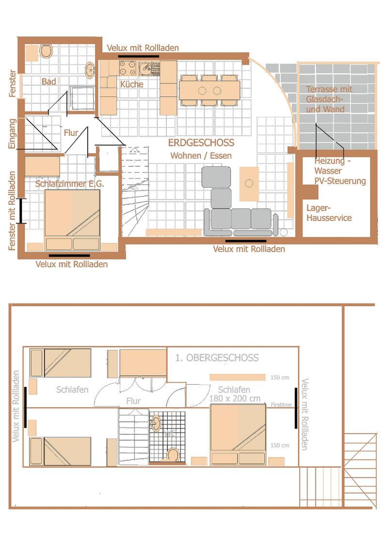 Im Obergeschoss befinden sich 2 weitere Schlafzimmer mit einem Doppelbett ( 160x200 cm) und SAT-TV, im