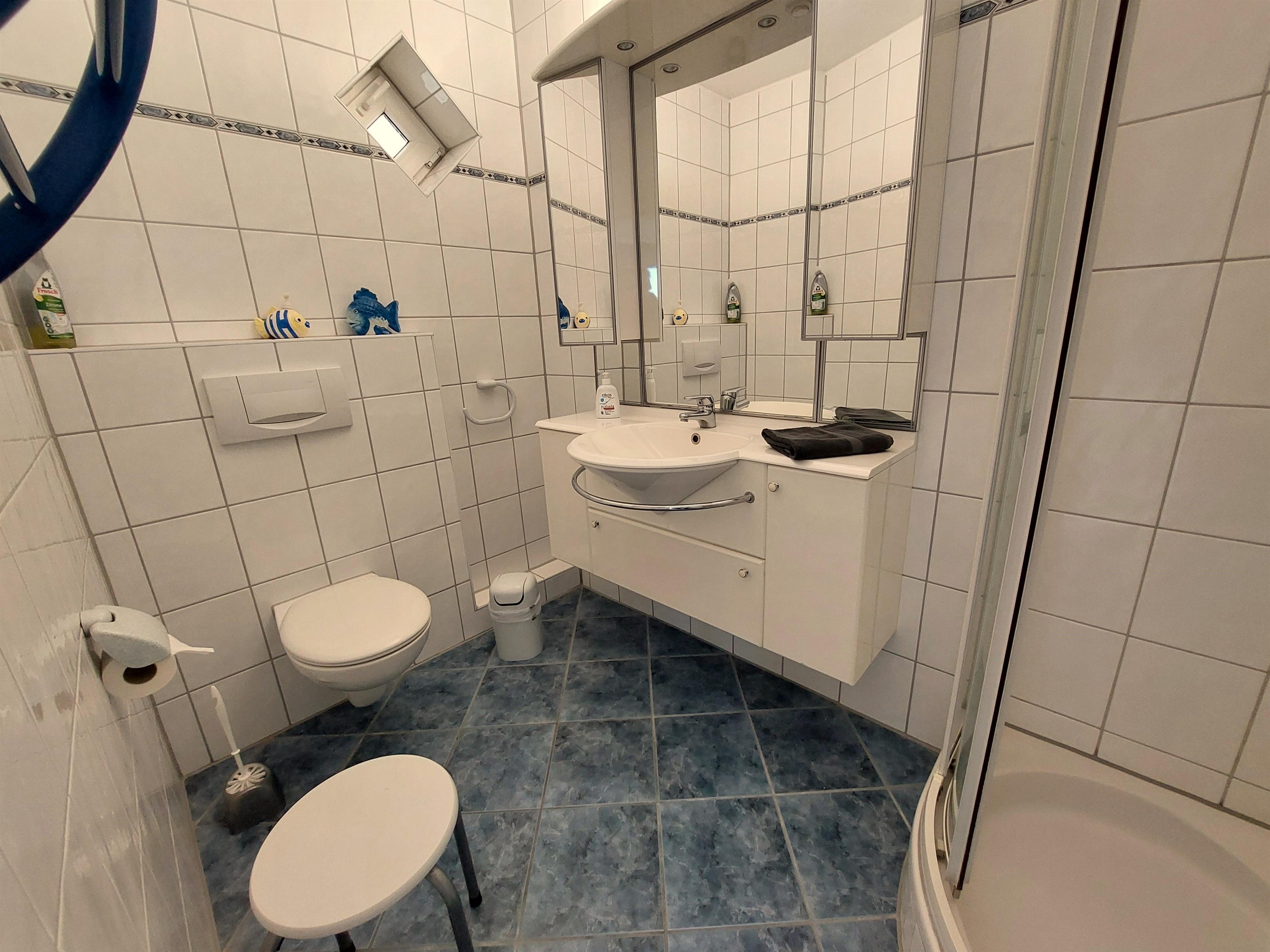 Modern eingerichtetes Bad. SAT - TV, und Radio . Der Wohn-, Küchen- und Badbereich ist mit einer Fußbodenheizung ausgestattet. Warme Füße !