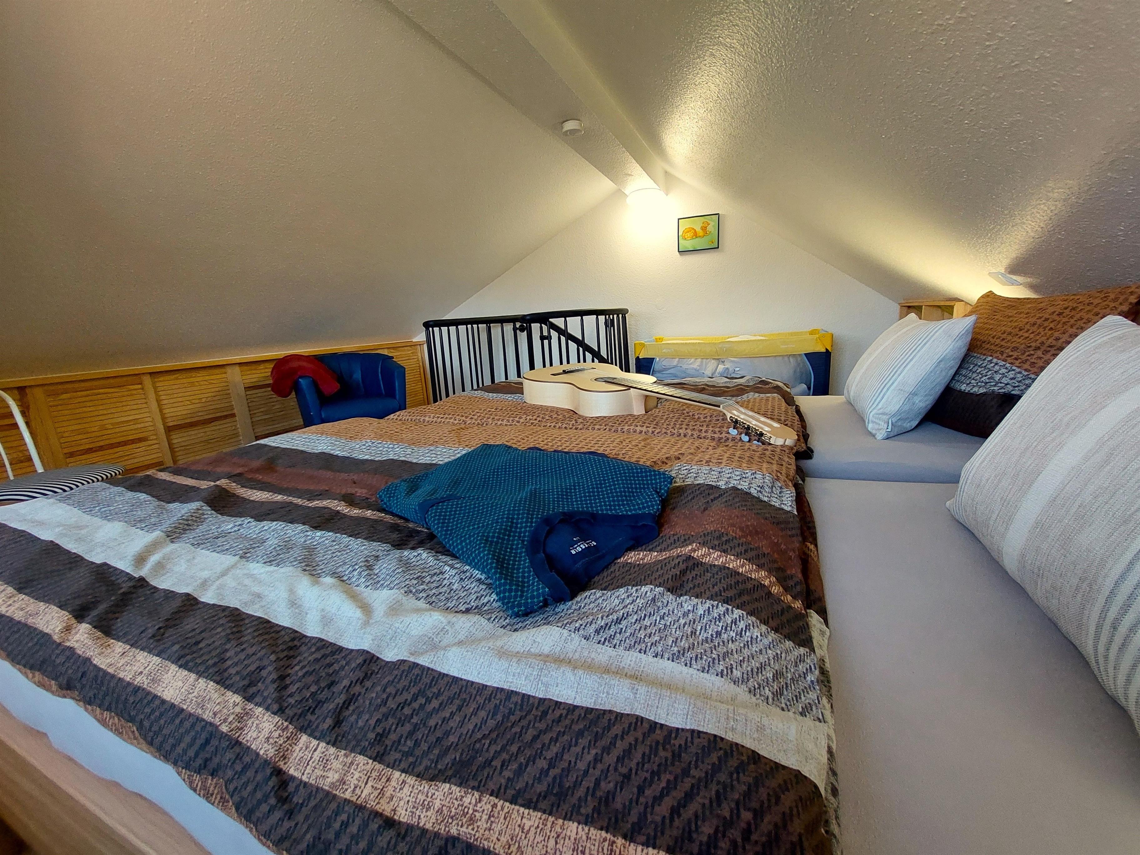 Bettengröße (90 cm c 2 mal 200 cm breit kombiniert zum Doppelbett, offenes Fußende). Der Zugang ist offen, keine Tür) Kinderreisebett und Kinderhochstuhl.