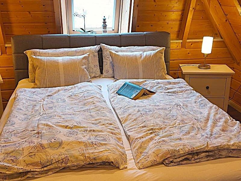 Aufgeteilt im Erdgeschoss mit einem Wohn-/Küchen-/Esszimmer mit Kamin, ein Duschbad mit bodengleicher Dusche und ein Schlafzimmer mit Doppelbett (160 x 200 cm mit 2 Eintelmatratzen ). Die Fenster sind mit Rollläden zur 100% Verdunkelung und Insektenschutz ausgestattet. Für den Kamin ist Kaminholz mitzubringen und der Kamin ist bei Abreise gereinigt zu hinterlassen
