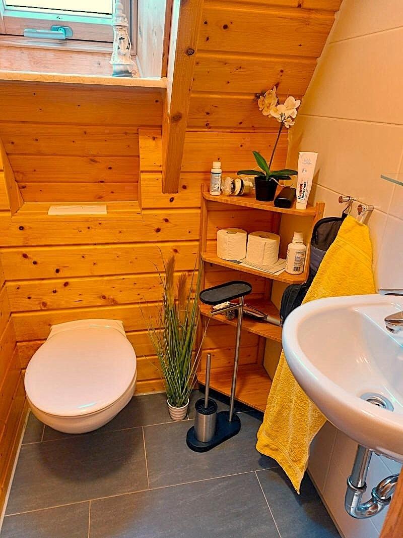 Im Erdgeschoss befindet ein Schlafzimmer mit Fernseher, ein Badezimmer mit Waschmaschine und der Wohn- und Essbereich mit Kaminofen und Fernseher mit DVD-Player sowie einer Musikanlage mit Bluetooth. Die Küche ist komplett eingerichtet/ausgestattet