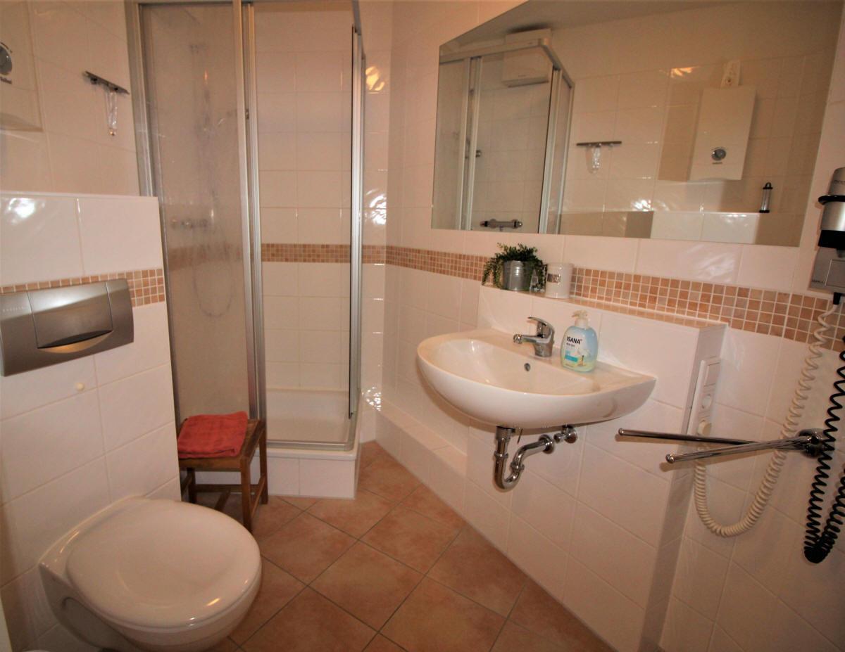 Das Badezimmer ist modern eingerichtet. Wohnung ist stufenlos über einen Fahrstuhl erreichbar. Im Hause gibt es eine Gemeinschaftswaschmaschine und einen Wäschetrockner im Münzbetrieb. Kostenloser PKW-Stellplatz vorhanden.