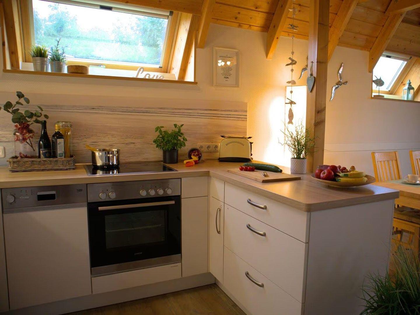 während die voll ausgestattete Küche das Kochen zum Vergnügen macht.