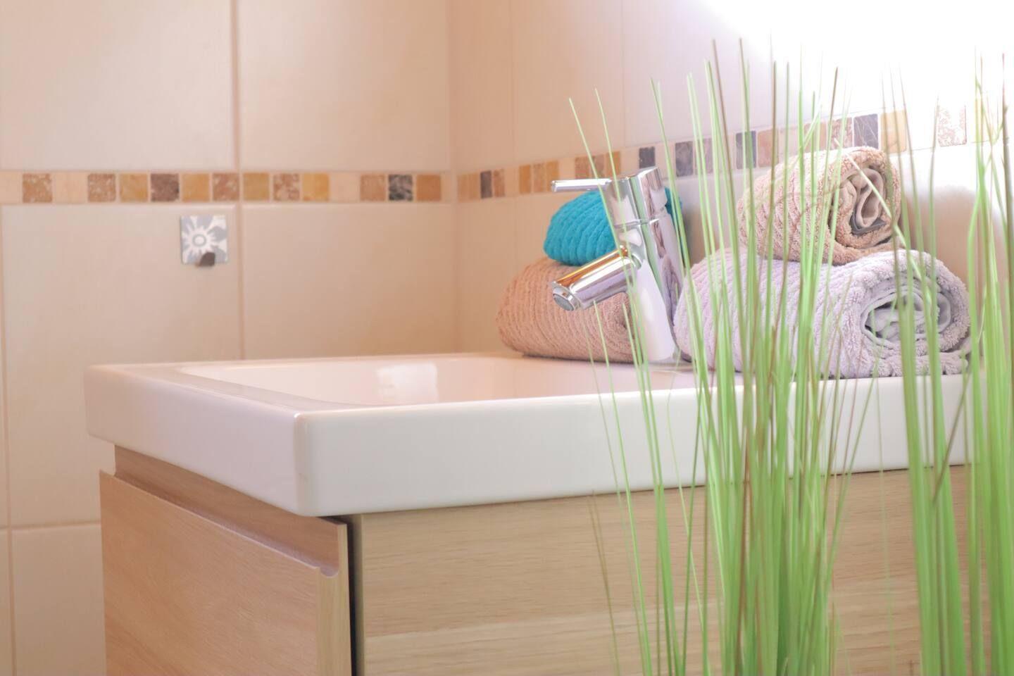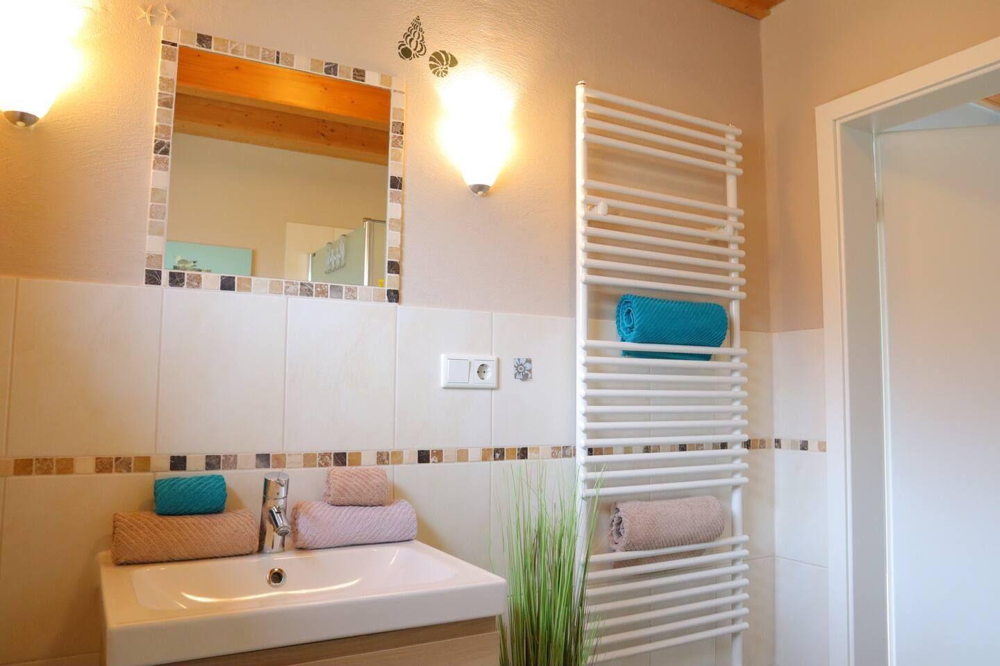 Im Badezimmer erwartet Sie eine moderne, ebenerdige Dusche, während ein zusätzliches kleines Bad im Obergeschoss für mehr Komfort sorgt.
