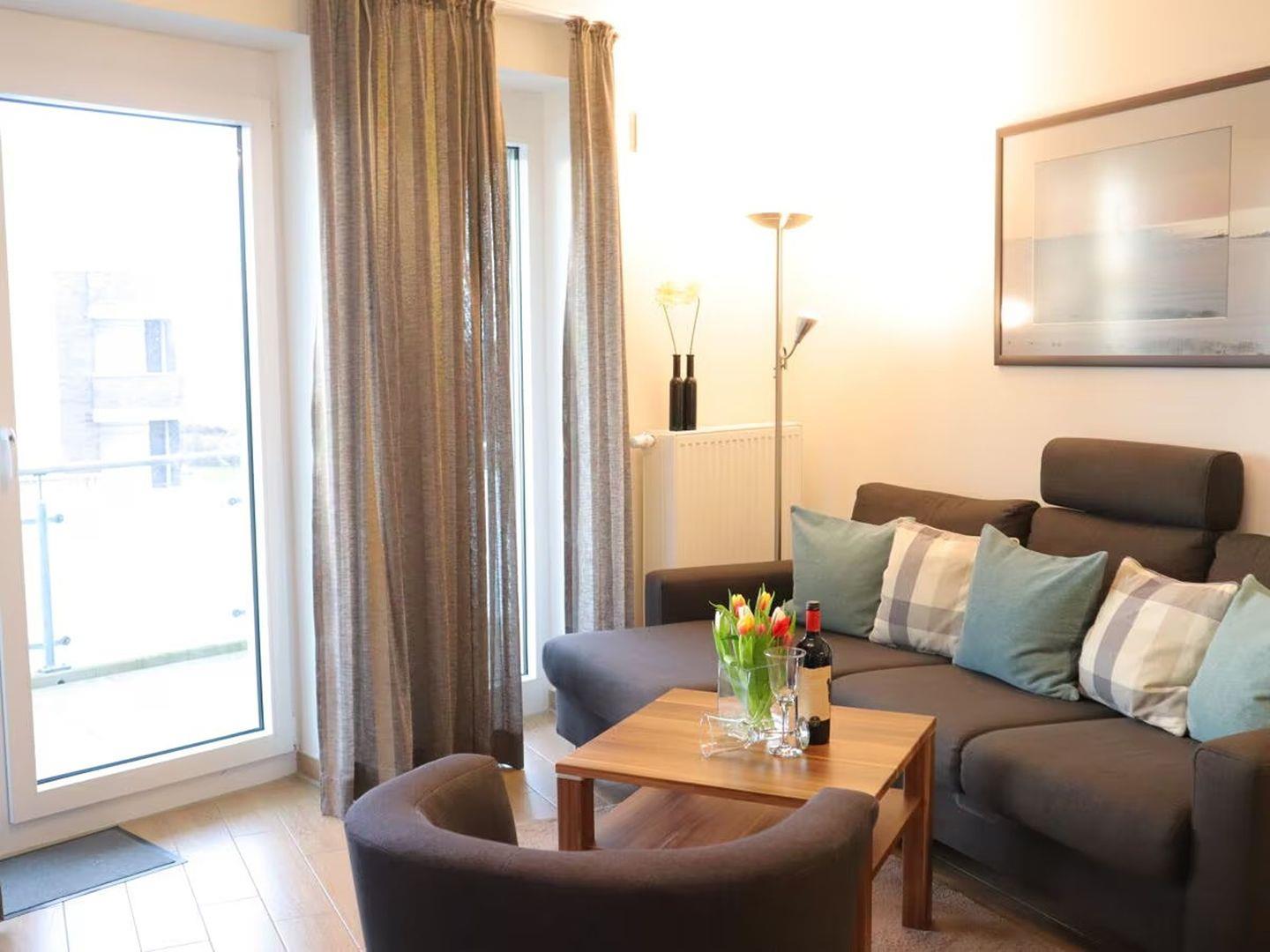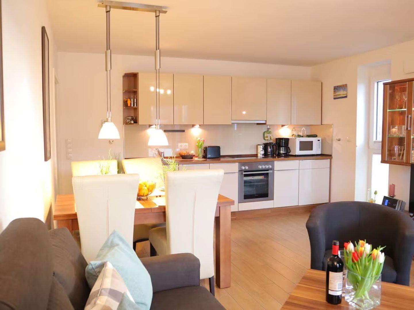 Der Wohn- und Essbereich ist offen gestaltet und lädt zum Verweilen ein. Die vollausgestattete Küche ermöglicht die Zubereitung köstlicher Mahlzeiten, die dann gemeinsam am Esstisch genossen werden können. Vom Wohnzimmer aus gelangen Sie auf den sonnigen Balkon mit Windschutz, der einen herrlichen Blick auf den grünen Deich und spektakuläre Sonnenuntergänge bietet.