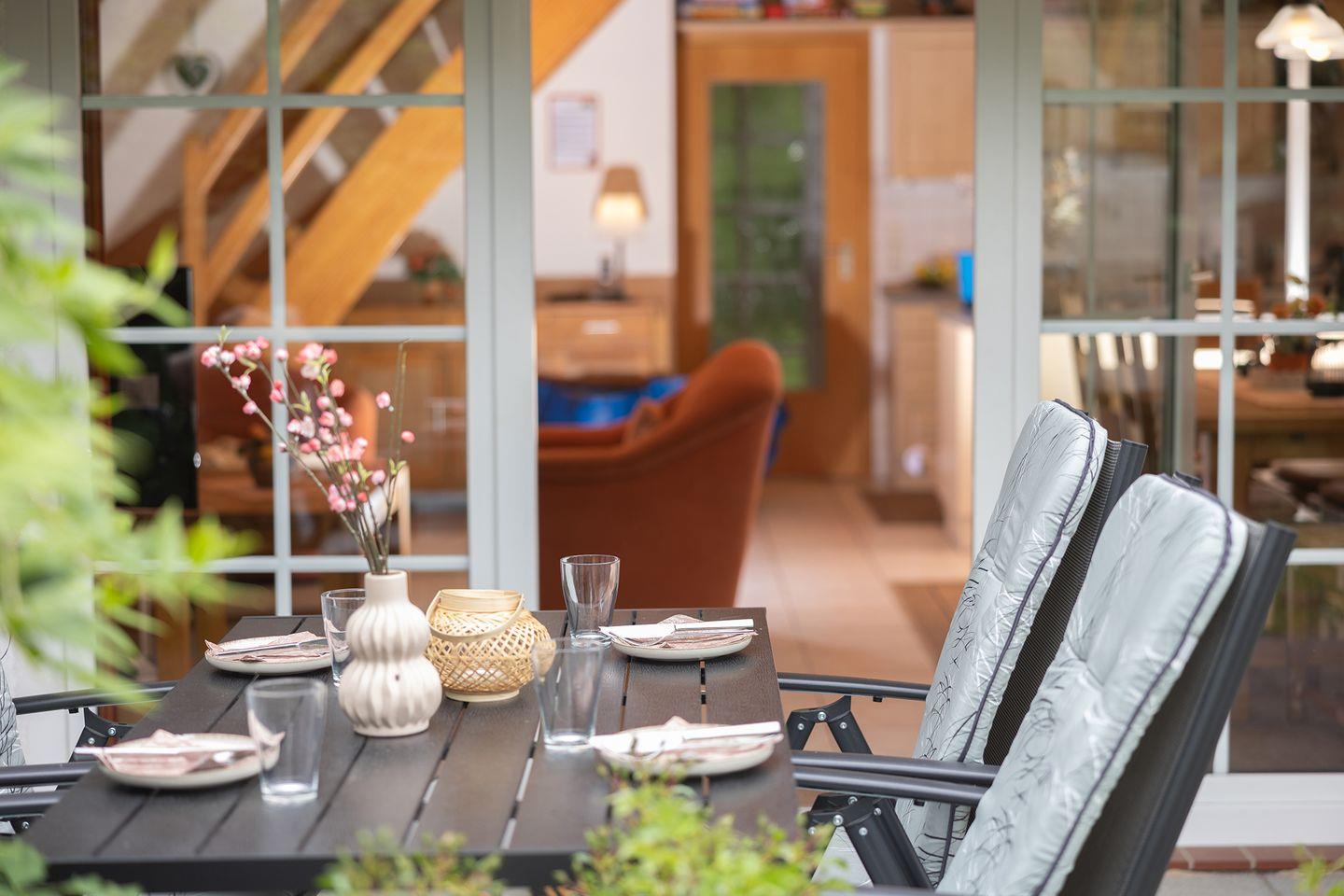 Im gepflegten Garten mit Terrasse, Sonnenliegen, Sonnenschirm und Grill lassen sich lange Sommertage genießen. Bis zu zwei Hunde sind erlaubt.
