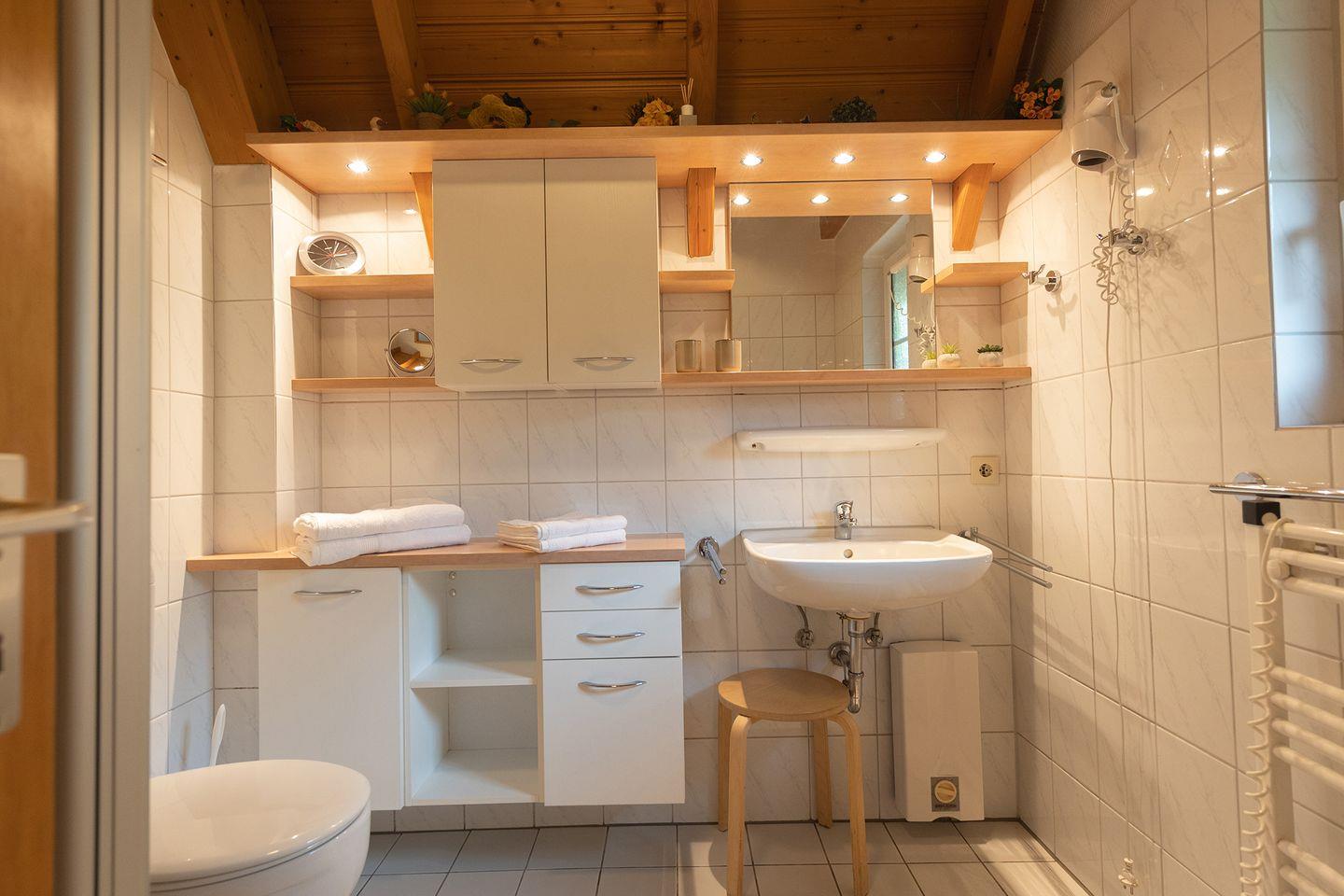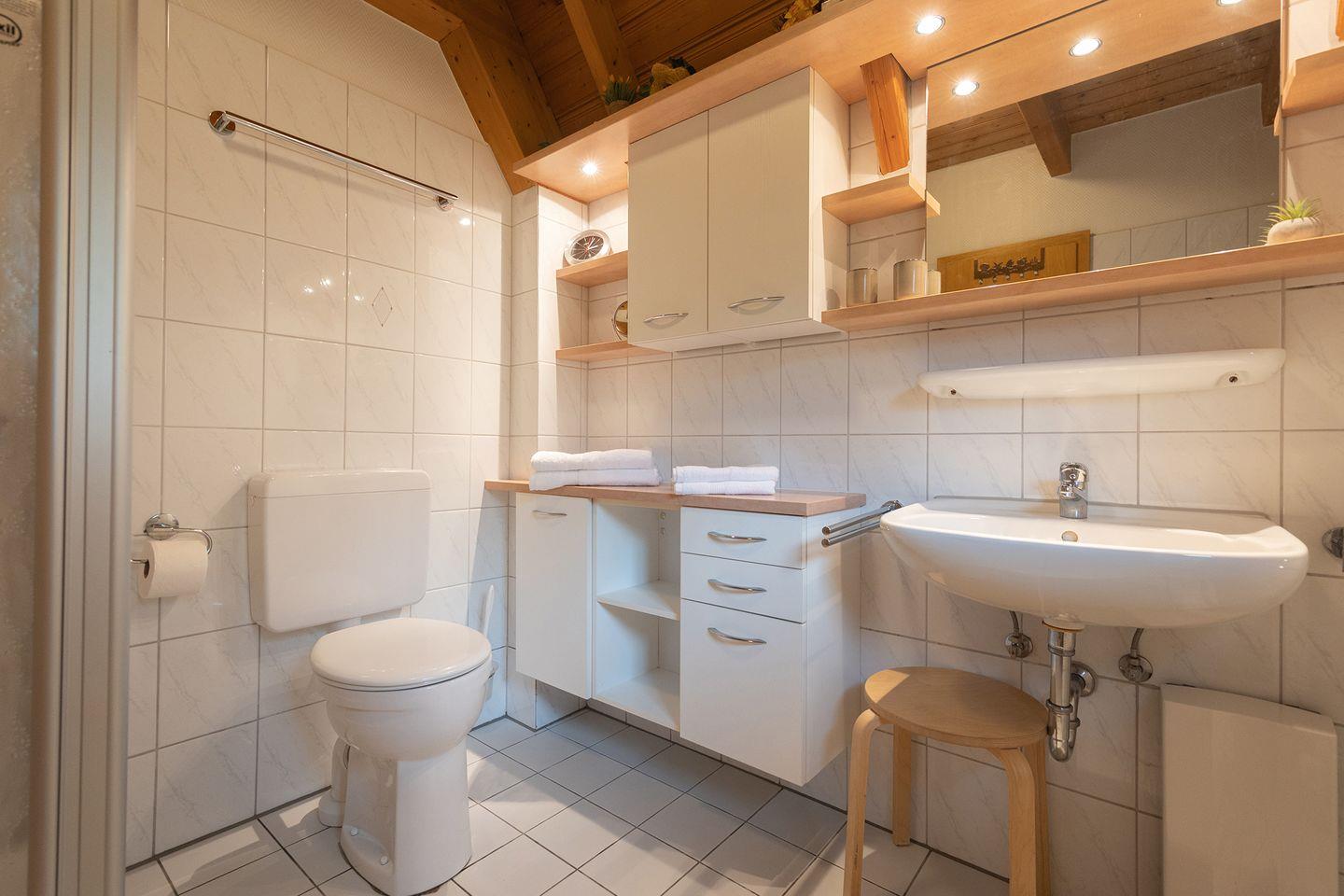 Der offene Wohnbereich mit Fliesen vereint Küche, Essplatz und Sofaecke. Hier wird zusammen gekocht, gegessen und gespielt. Die gut ausgestattete Küche bietet alles, was man im Familienalltag braucht. Zwei Schlafzimmer mit Laminat und Sichtschutz an den Fenstern sorgen für erholsame Nächte. Ein Bad mit Dusche und Wanne sowie ein zusätzliches Gäste-WC bringen Komfort. Kinderbett, Hochstuhl und Treppengitter sind selbstverständlich vorhanden.