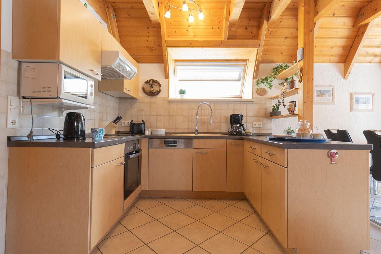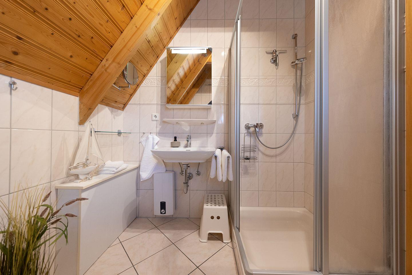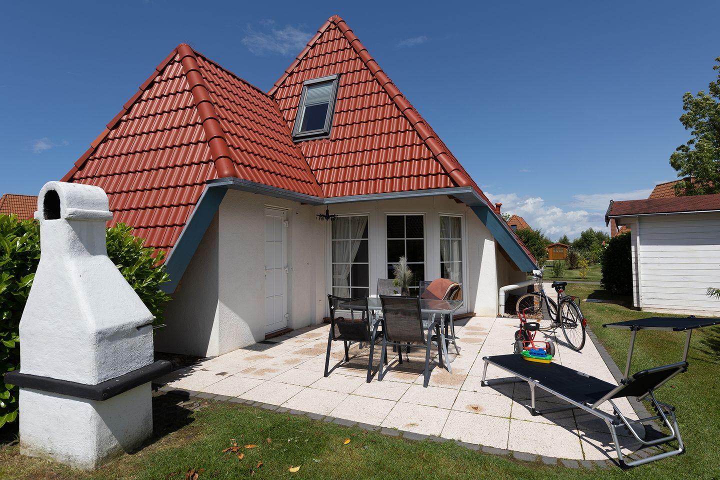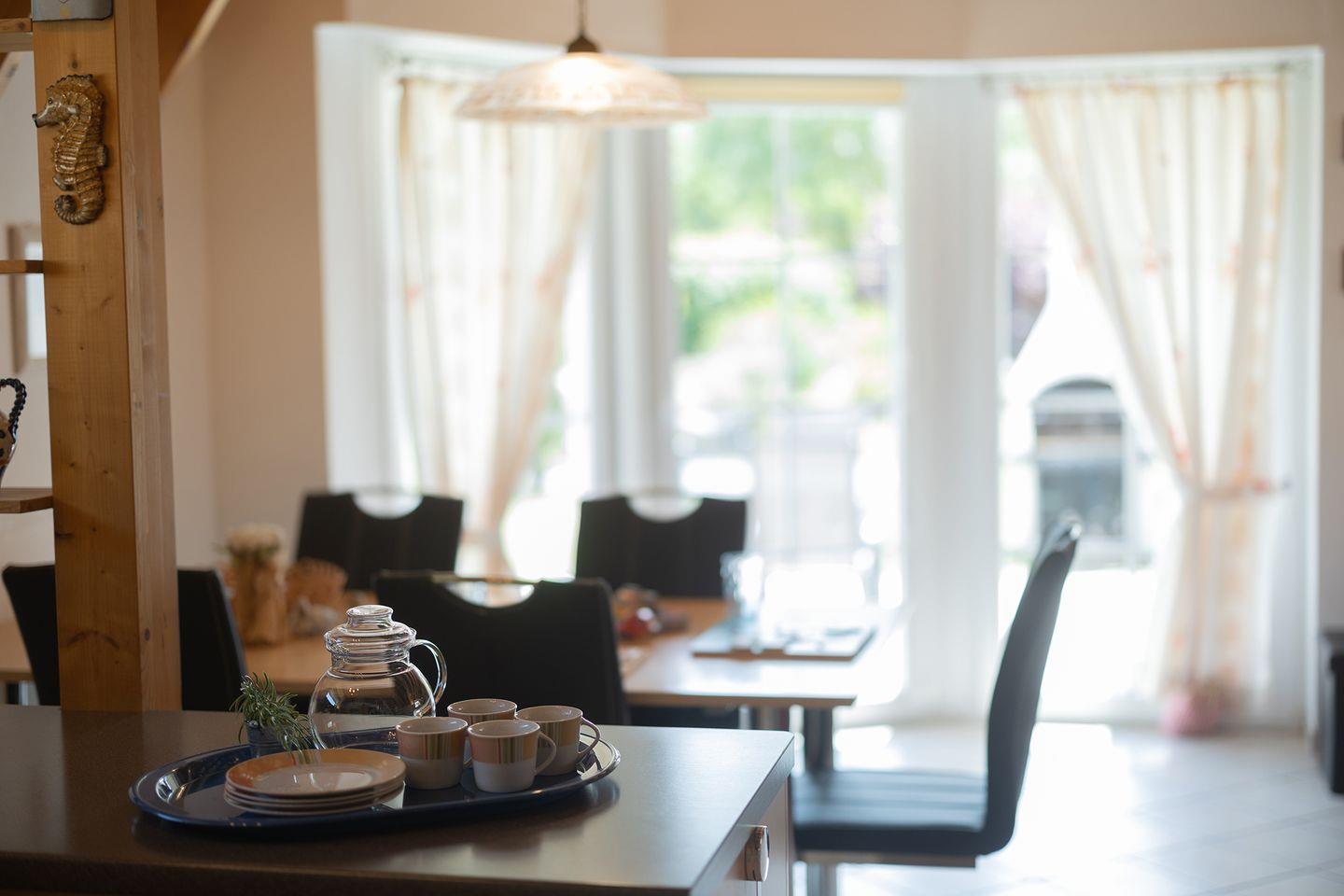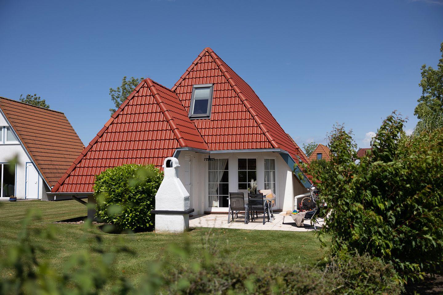Unten Fliesen, oben Teppich: funktional und gemütlich zugleich. Draußen wartet ein grüner Garten mit möblierter Terrasse und Sonnenliegen, perfekt für eine Teepause nach dem Deichspaziergang.