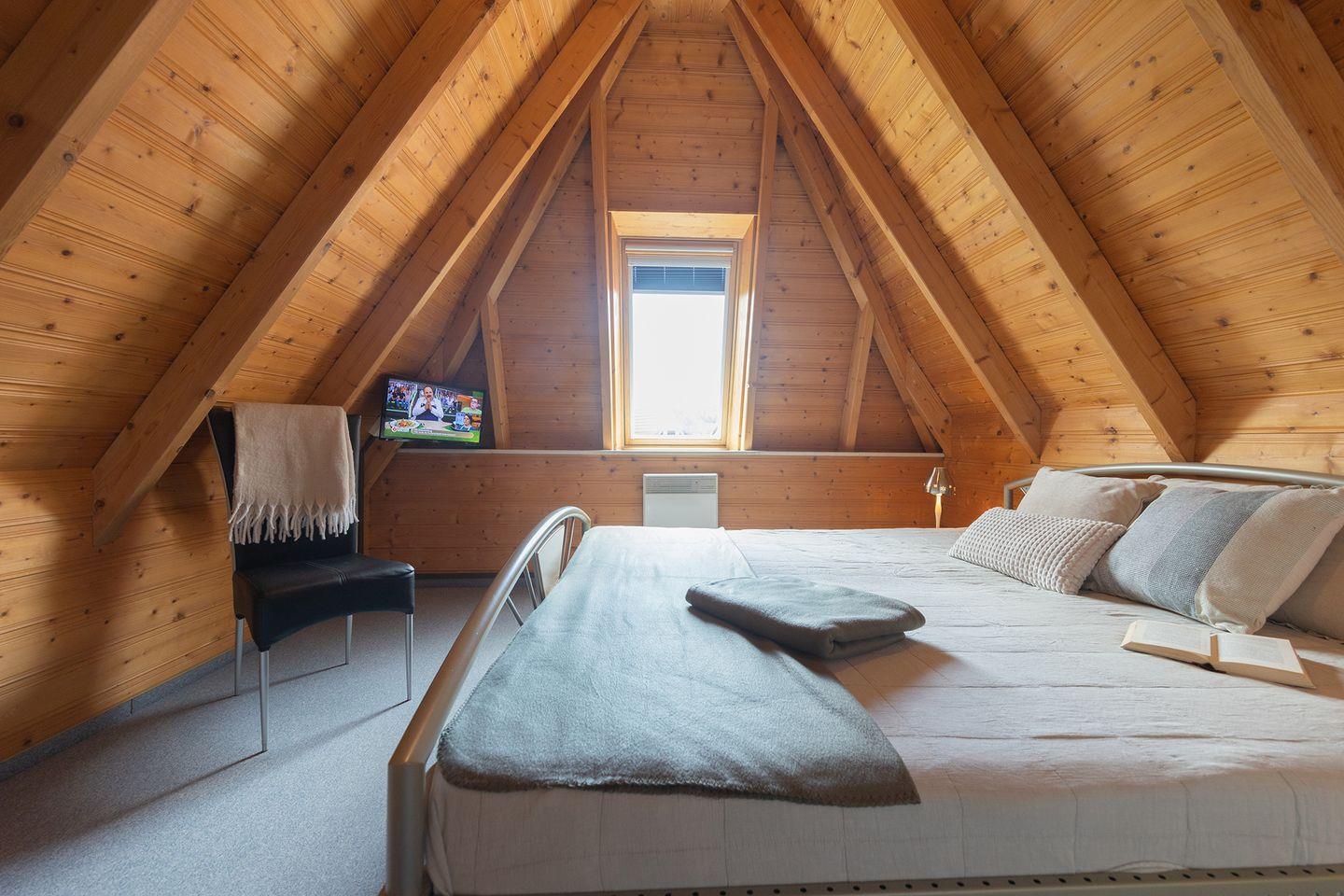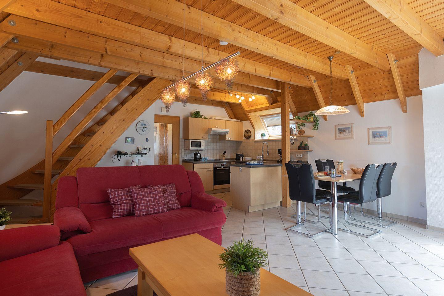 85?qm auf zwei Etagen bieten Platz für bis zu sechs Personen: mit zwei Schlafzimmern mit Doppelbetten, einem Kinderzimmer mit getrennten Betten, zwei WCs und einem offenen Wohnbereich mit Küche.