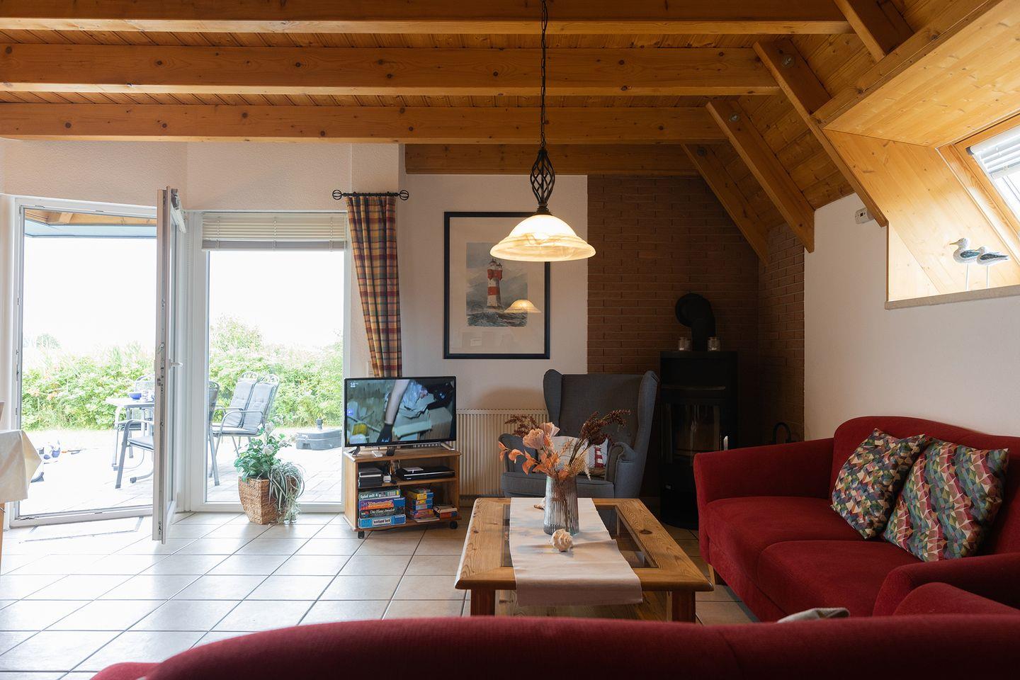 Die großzügige Süd-Terrasse bietet weiten Blick über Felder bis zum Deich und wird zum zweiten Wohnzimmer im Freien. Viele Familien erzählen, wie schnell hier der Trubel verblasst: morgens Brötchen holen, mittags barfuß ins Watt, abends den Tag vor dem Kamin oder auf der Terrasse ausklingen lassen. Hier findet man wirklich Ruhe. Nordsee pur.
