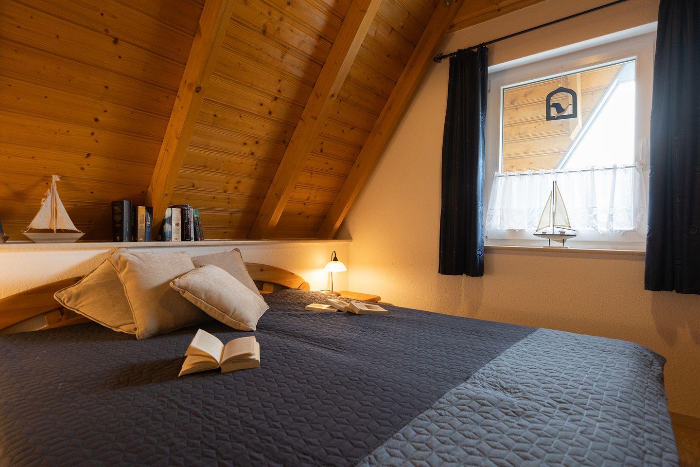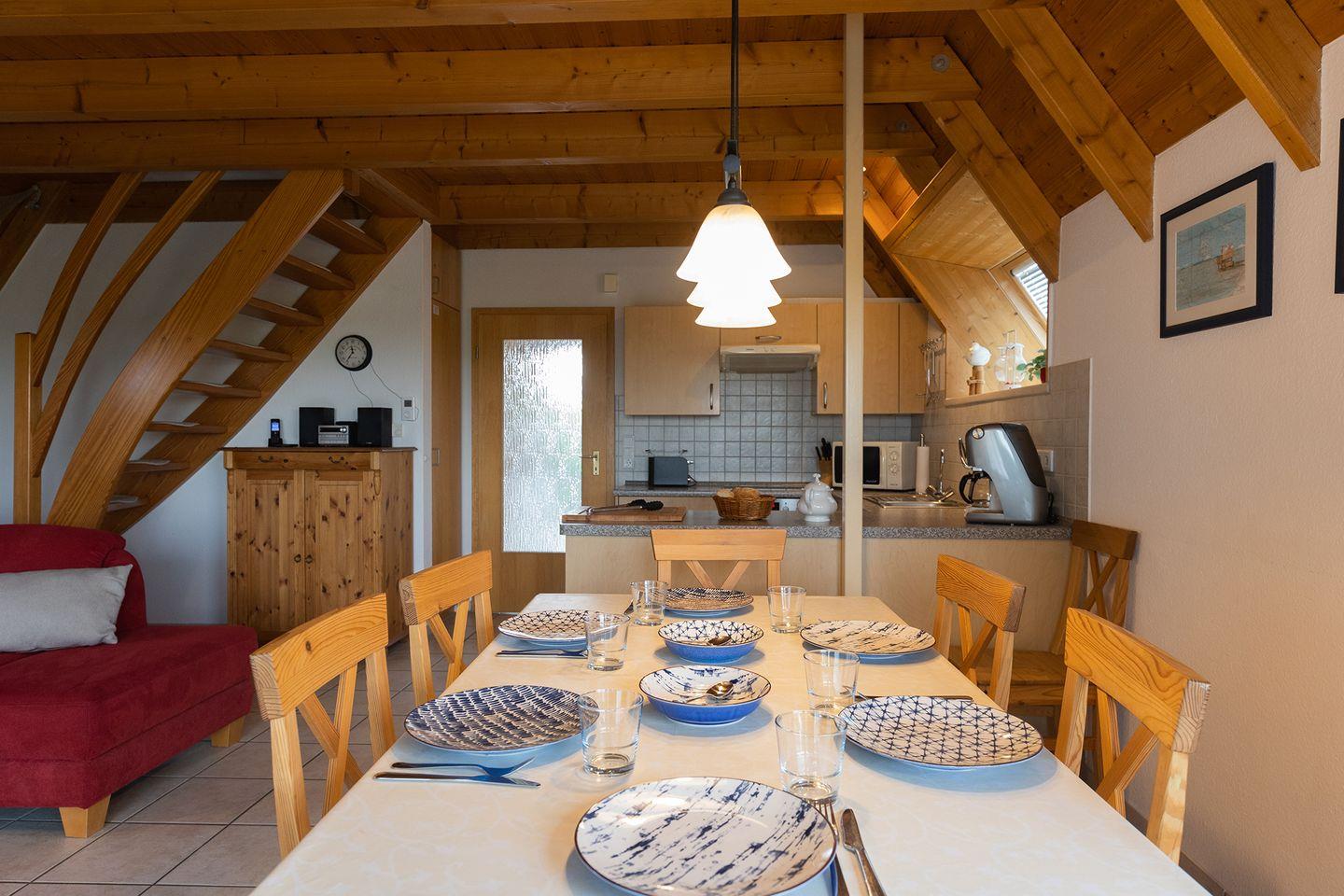 Wenn der erste Sonnenstrahl auf die Süd-Terrasse fällt, beginnt der Tag im Ferienhaus wie von selbst. Auf zwei Ebenen verteilen sich 85 m² für bis zu sechs Personen: Im Erdgeschoss verschmelzen das geflieste Wohn-Esszimmer mit Kaminofen und der große Esstisch mit einer voll ausgestatteten, offenen Küche. Daneben liegen das Schlafzimmer mit Doppelbett und ein helles Duschbad mit Waschmaschine.