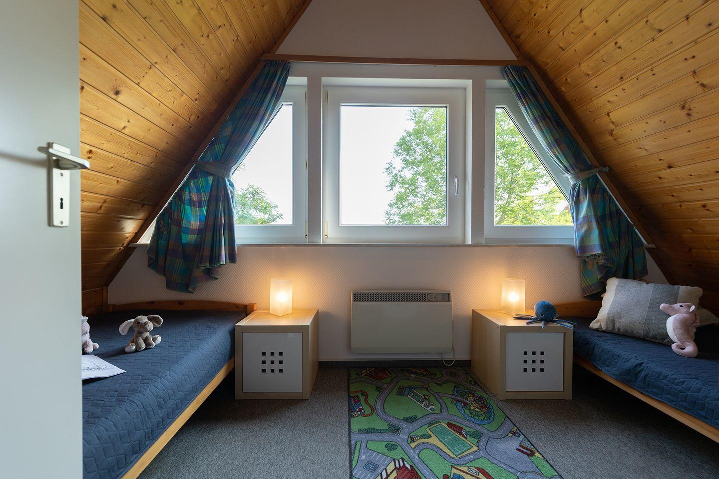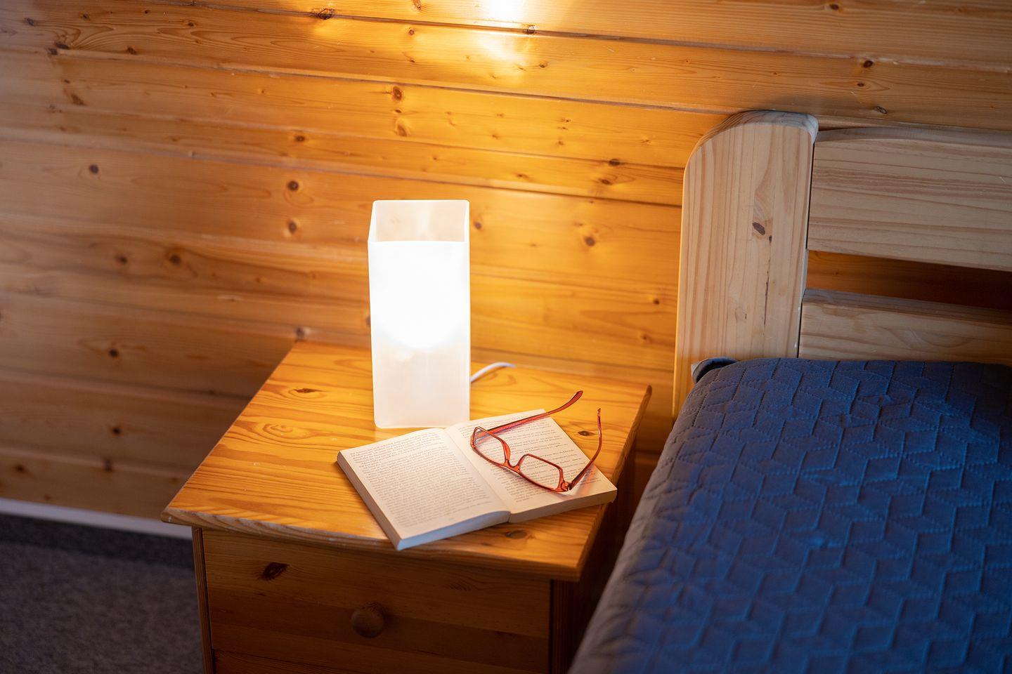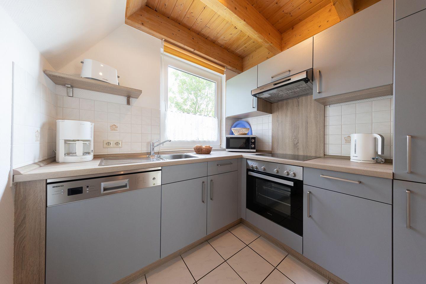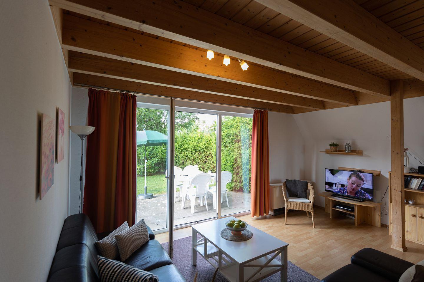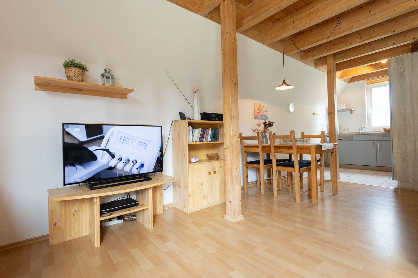 Der Wohnbereich mit Laminatboden, Sofaecke, Essplatz und zwei Fernsehern ist gemütlich und praktisch zugleich. Für Unterhaltung sorgen Blu-ray- und DVD-Player, Radio, CD-Spieler, WLAN und Spiele. Die offene Küche ist voll ausgestattet mi8t Ceranfeld, Backofen, Spülmaschine, Mikrowelle, Kaffeemaschine und mehr. Zwei Schlafzimmer mit Teppichboden bieten Rückzugsorte, ein Kinderbett und Hochstuhl sind vorhanden.