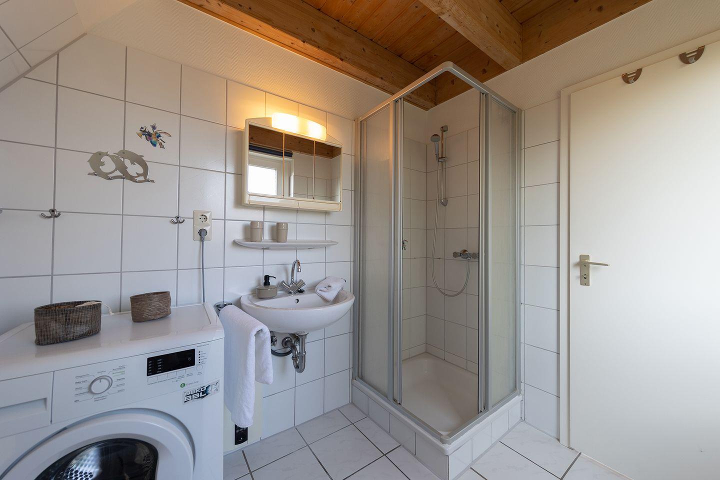 Im Bad gibt’s Dusche mit Wanne, Haartrockner und Fenster, zusätzlich ein Gäste-WC. Die eigene Waschmaschine erleichtert den Alltag. Steckdosensicherungen und Treppengitter machen das Haus familienfreundlich. Ein abschließbarer Abstellraum steht ebenfalls zur Verfügung.