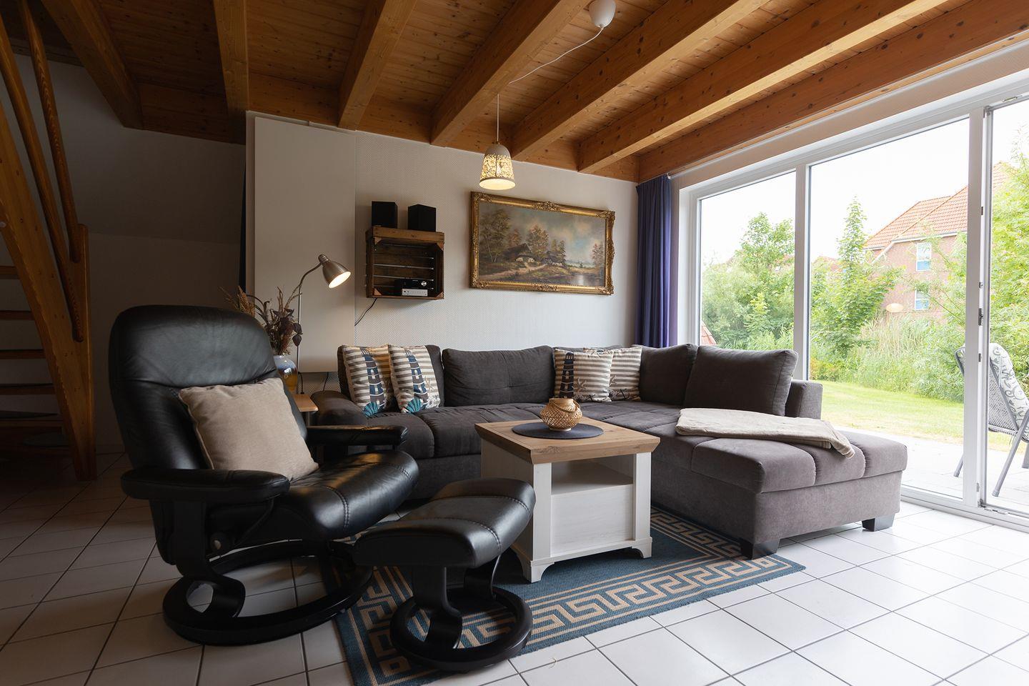 Die möblierte Terrasse mit Sonnenschirm, Liegen und Grill grenzt an den gepflegten Garten, ideal für entspannte Stunden draußen. Bis zu zwei Hunde dürfen mitreisen. Kostenfreier Parkplatz ist am Haus, die E-Ladesäule ist in der Anlage. Strand, Kutterhafen und Leuchtturm Obereversand erreicht ihr bequem zu Fuß – für eine Familienzeit am Meer, wie sie sein soll.
