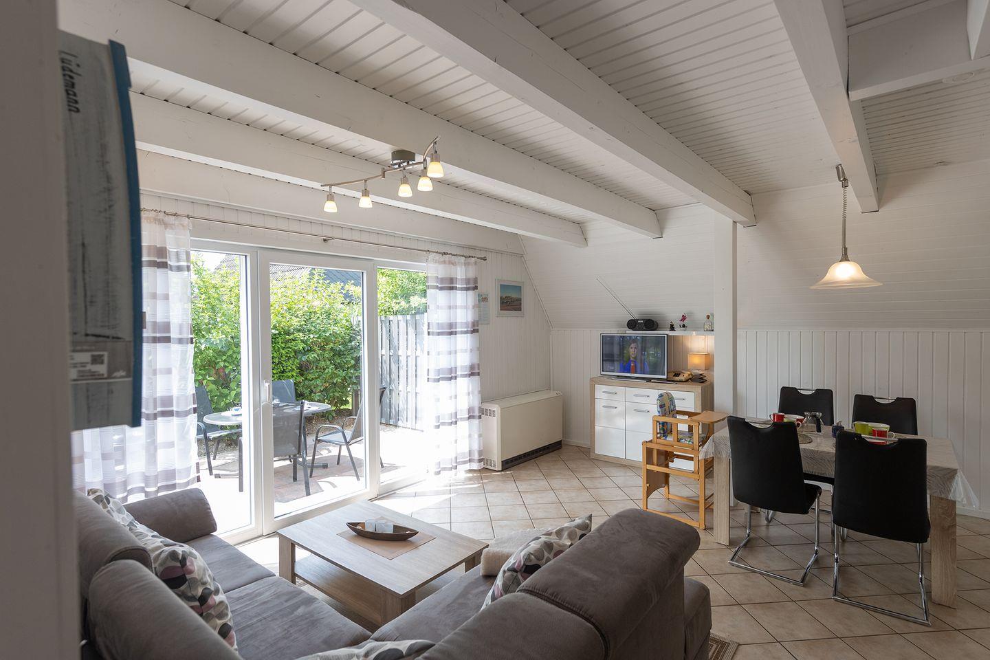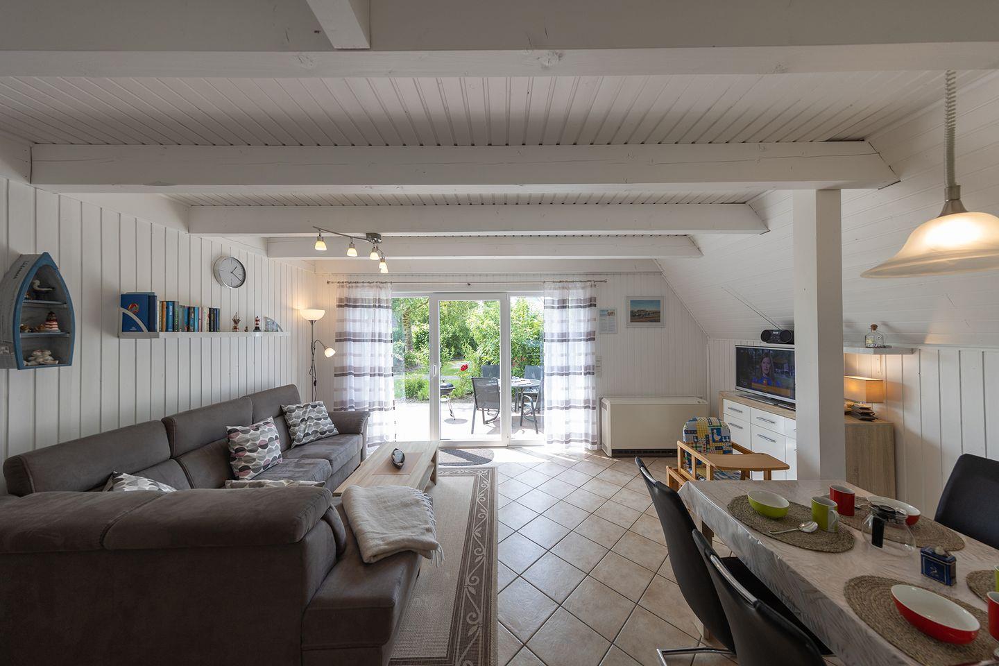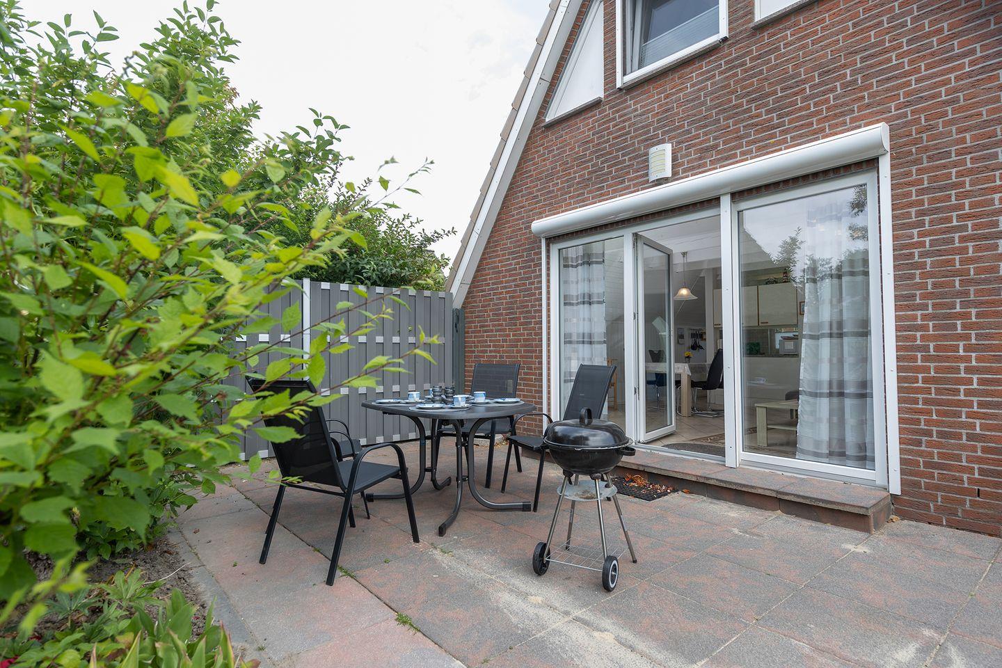 Im Garten mit Terrasse, Grill, Gartenmöbeln und Sonnenliegen lässt sich die Familienzeit am Meer genießen – in Strandnähe und mit Garten. WLAN, Waschmaschine und Spiele sind ebenfalls vorhanden. Eine E-Ladesäule in der Anlage sowie kostenfreie Parkplätze am Haus sorgen für Komfort.