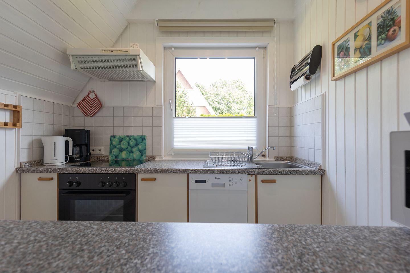 In der offenen Küche mit Spülmaschine, Ceranfeld und Mikrowelle ist alles für Familienmahlzeiten vorhanden. Kinderbett, Hochstuhl, Treppengitter und Steckdosensicherungen machen das Haus besonders familienfreundlich.