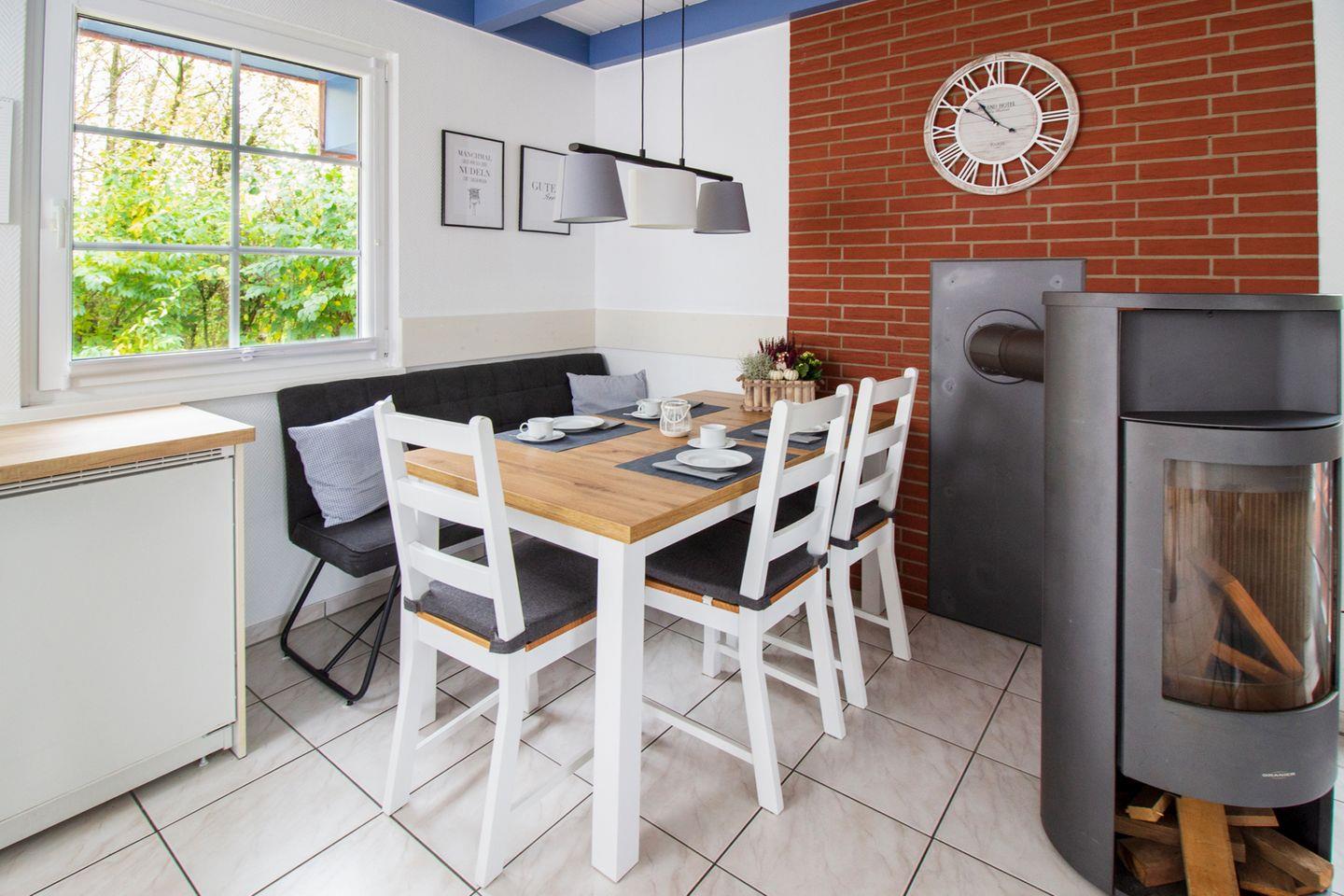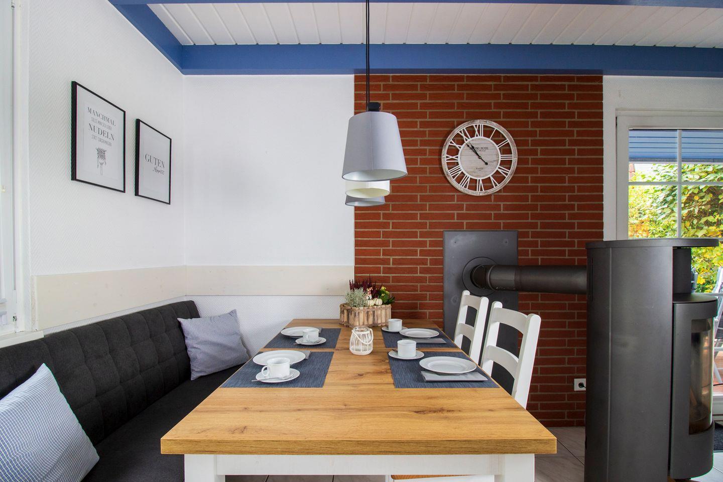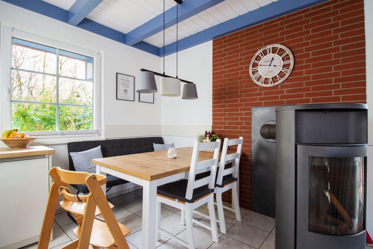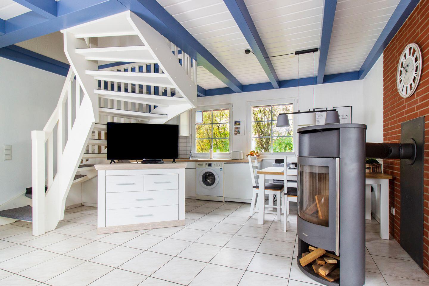 Im Erdgeschoss befinden sich ein Schlafzimmer mit erhöhten Betten, ein gemütlicher Wohnbereich mit Kaminofen sowie eine offene Küche mit großem Esstisch. Bücher, Spiele und helle Räume sorgen für entspannte Stunden, auch wenn das Wetter mal rauer wird. Das Obergeschoss mit Laminatboden bietet ein Elternschlafzimmer und ein weiteres mit getrennten Betten.