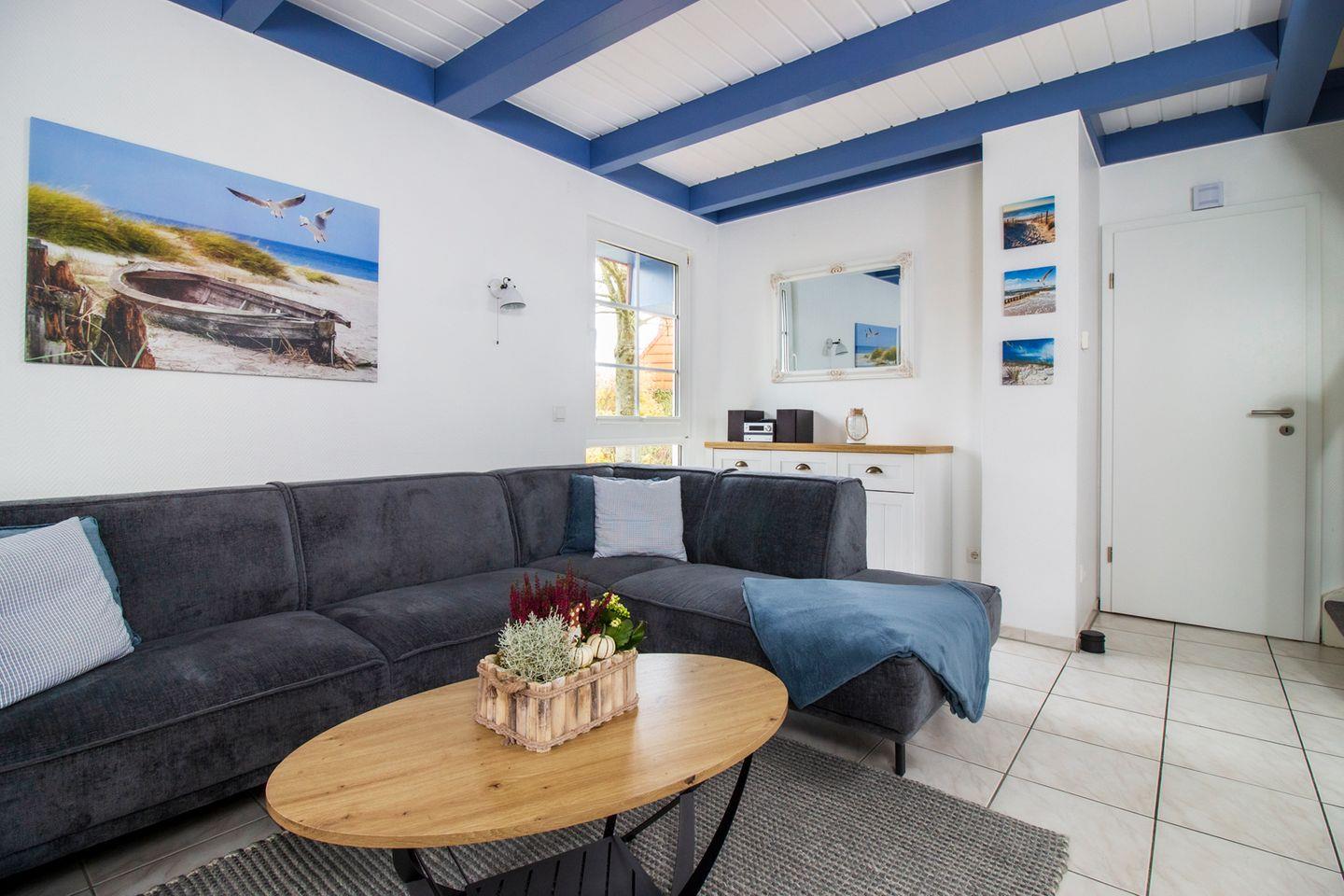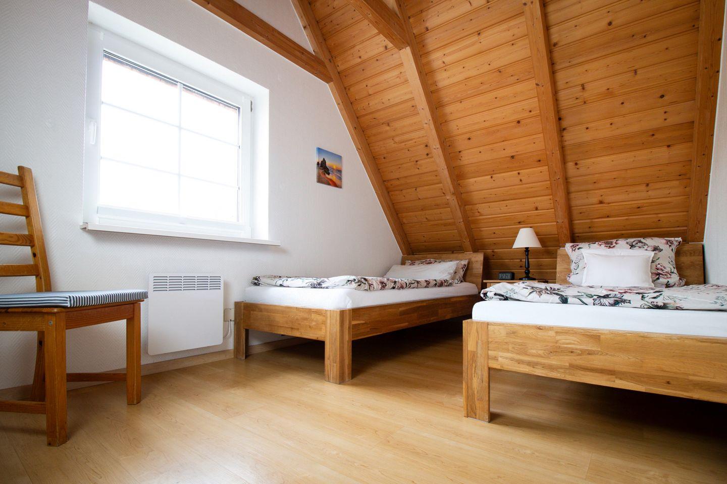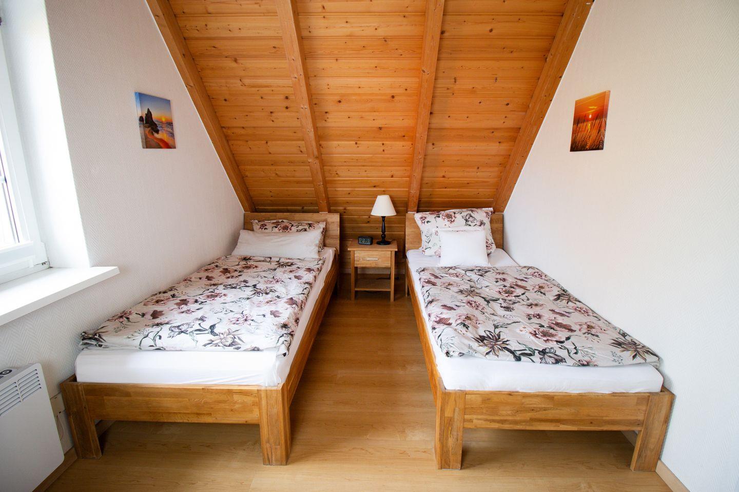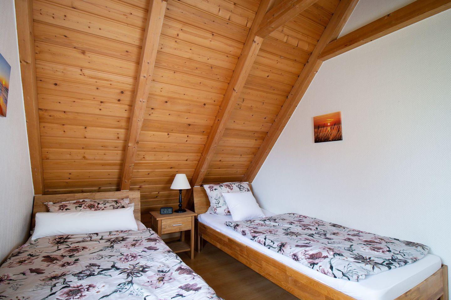 Im Erdgeschoss befinden sich ein Schlafzimmer mit erhöhten Betten, ein gemütlicher Wohnbereich mit Kaminofen sowie eine offene Küche mit großem Esstisch. Bücher, Spiele und helle Räume sorgen für entspannte Stunden, auch wenn das Wetter mal rauer wird. Das Obergeschoss mit Laminatboden bietet ein Elternschlafzimmer und ein weiteres mit getrennten Betten.